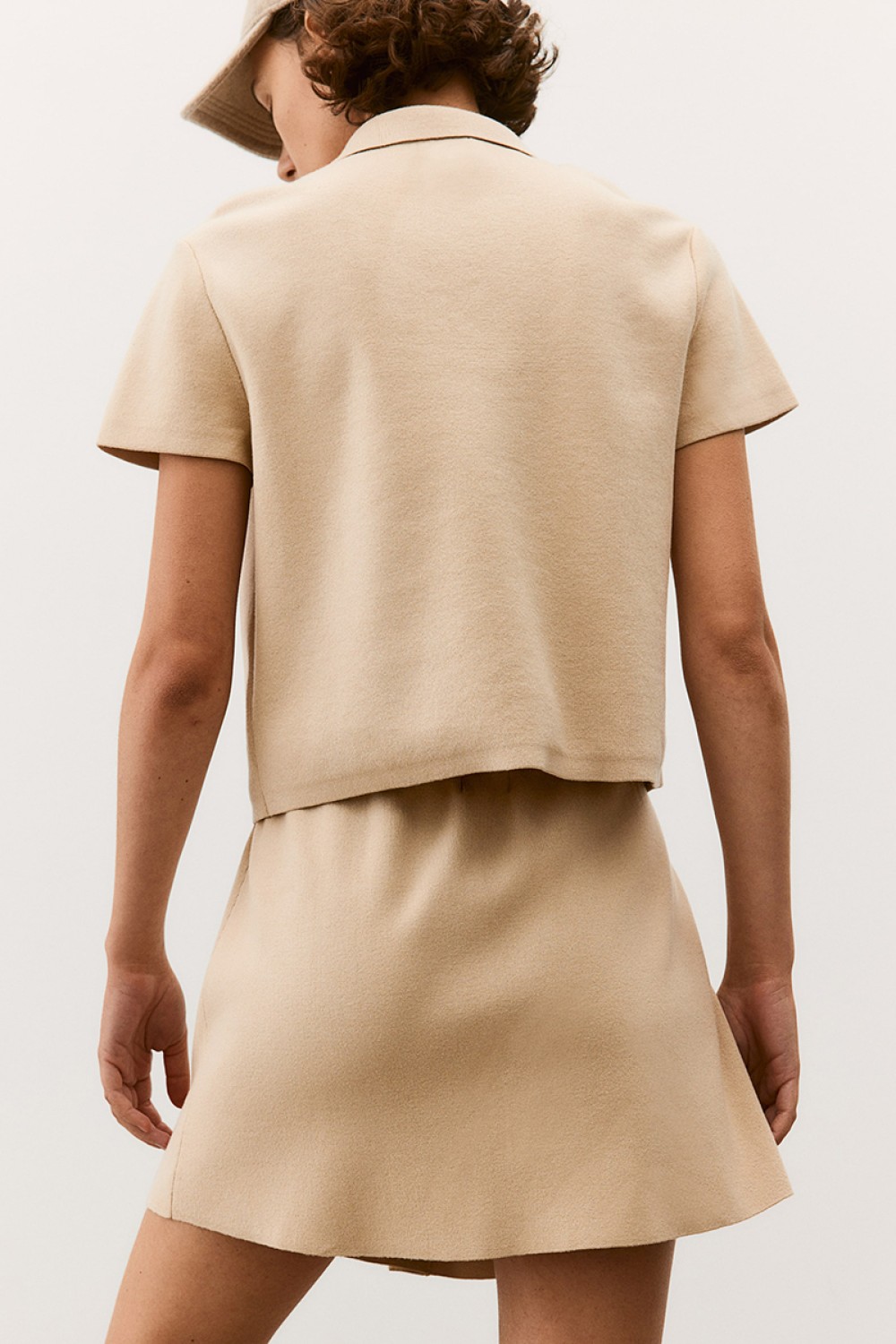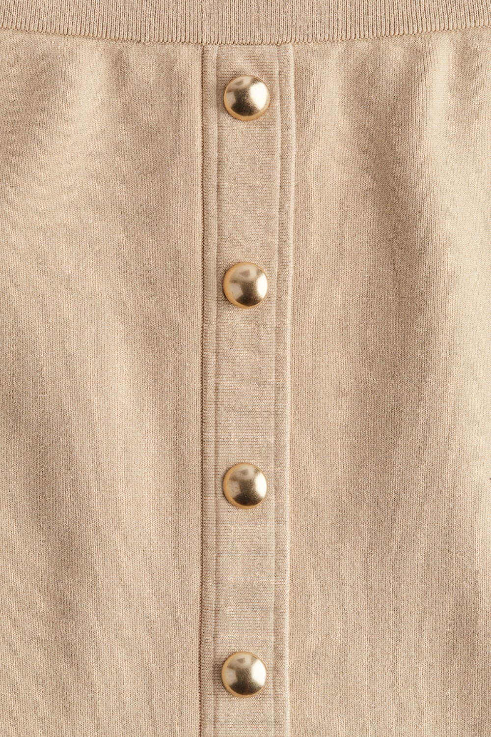 Short, fitted skirt in a fine knit. High waist, elasticized waistband, and decorative buttons full length of front.