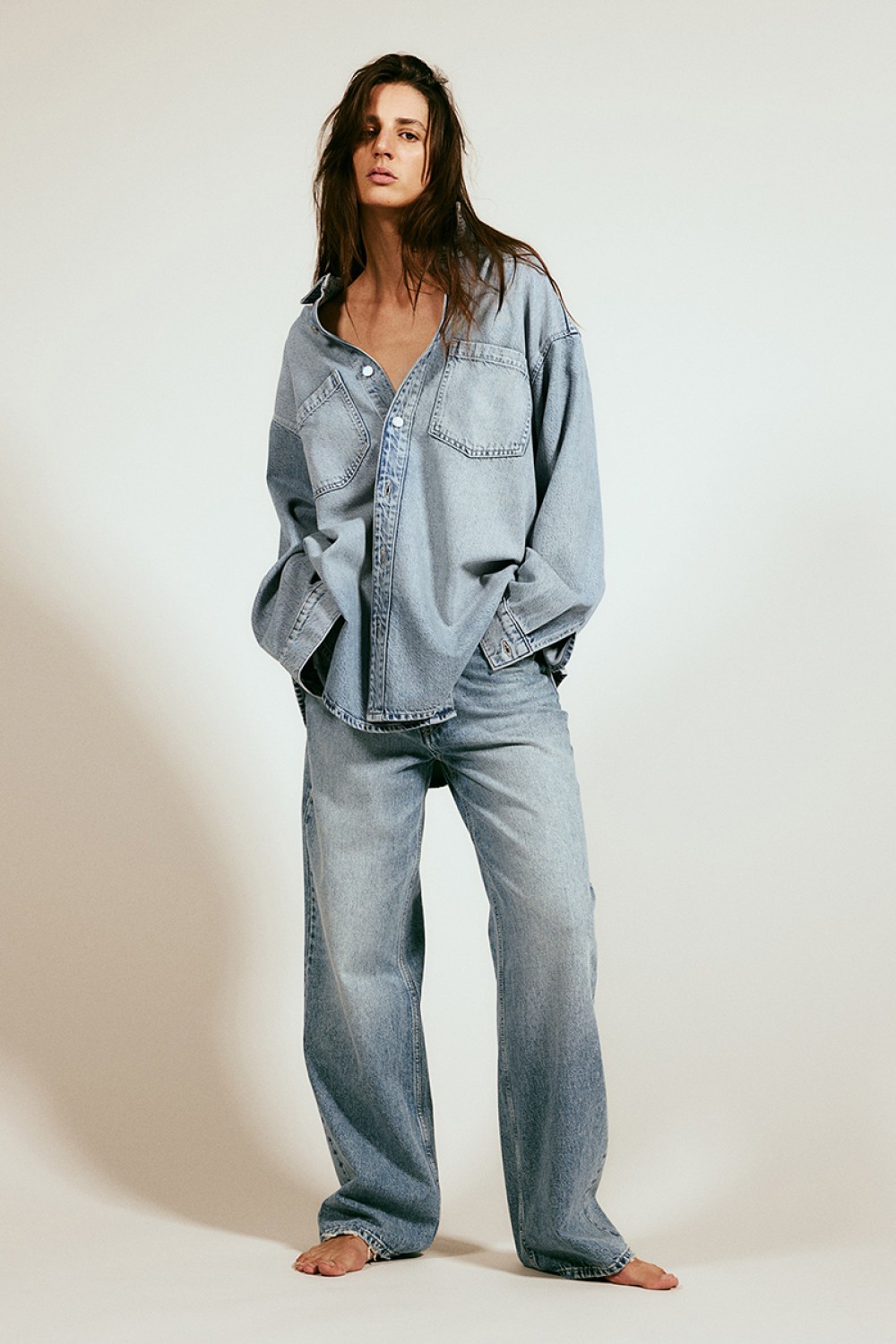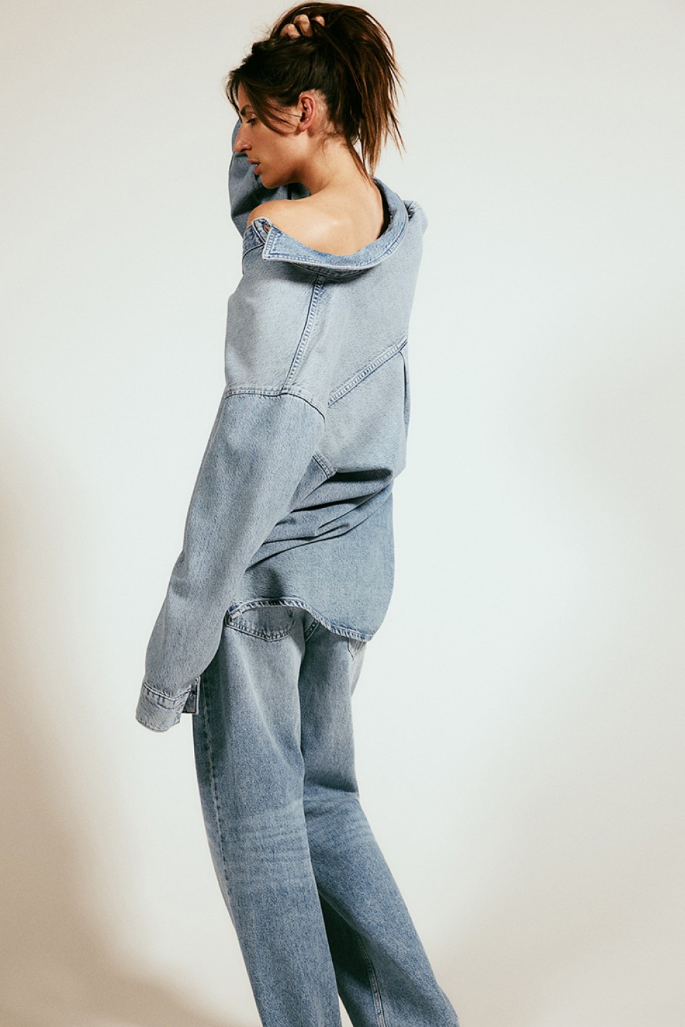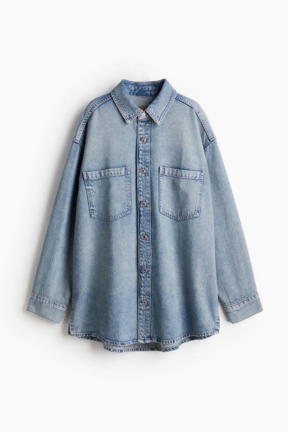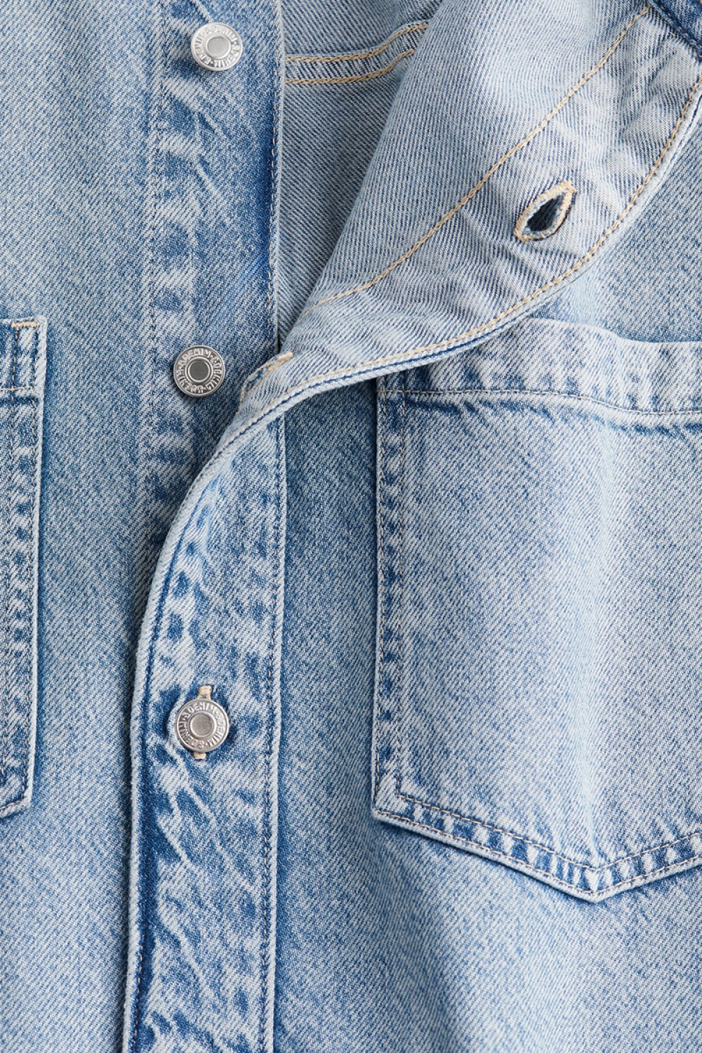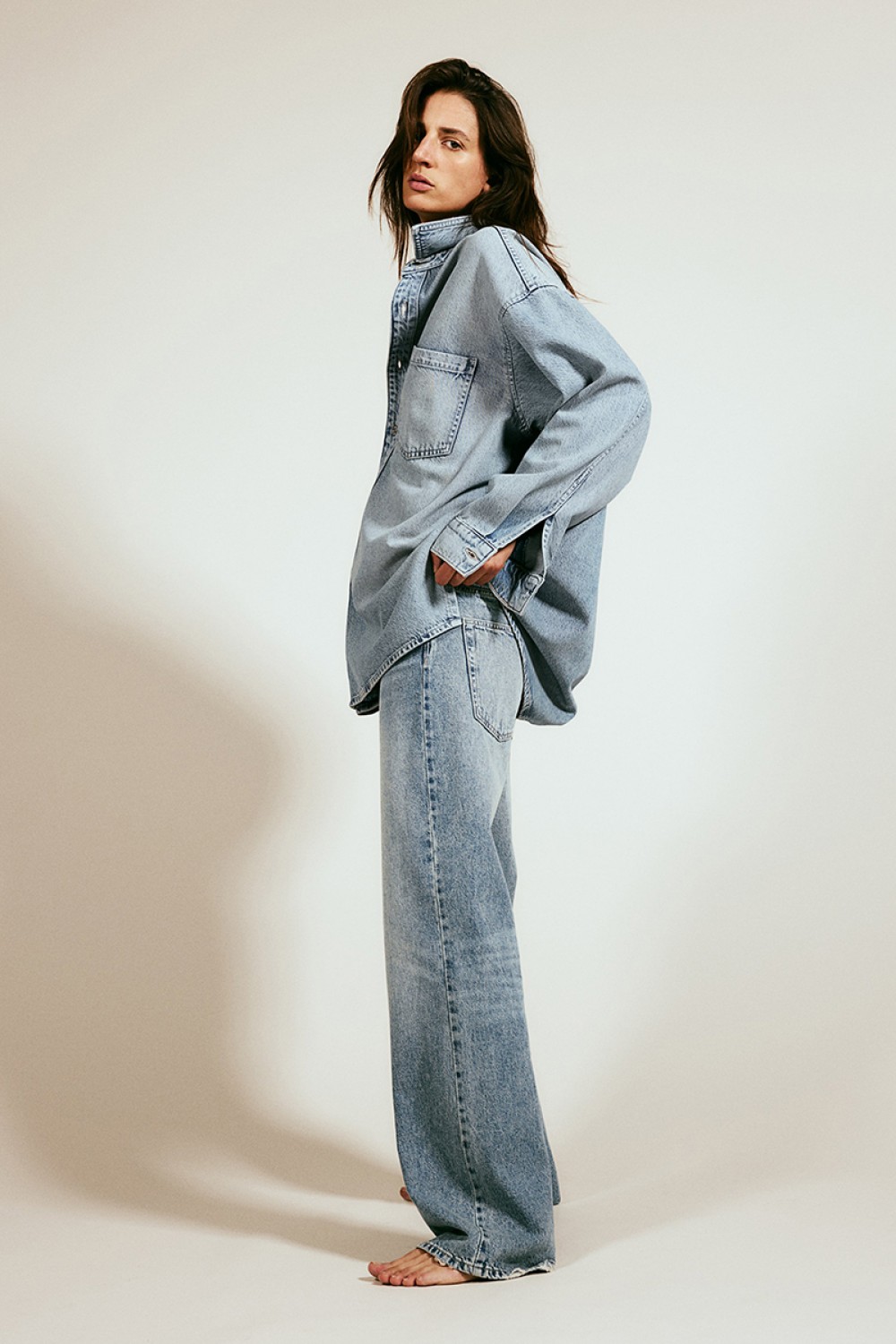 Loose-fit shirt in supersoft, featherlight denim. Collar, buttons at front, patch chest pockets, and a yoke at back with box pleat. Forward-facing shoulder seams, dropped shoulders, and long sleeves with button at cuffs. Gently rounded hem, slightly longer at back.