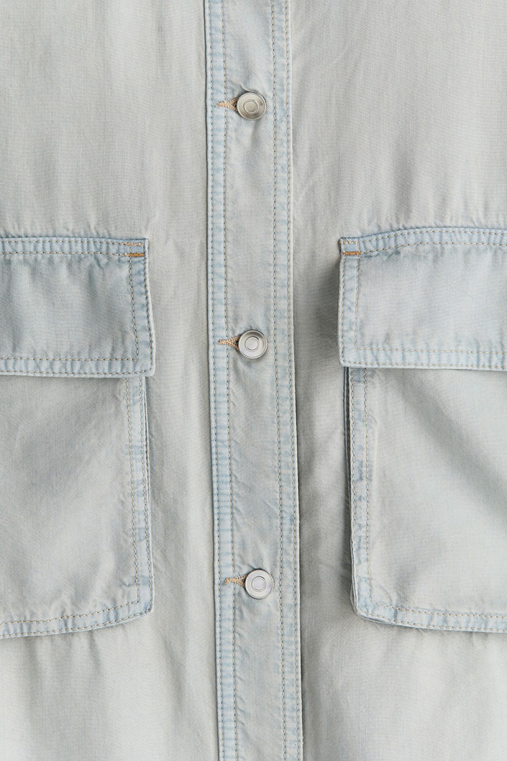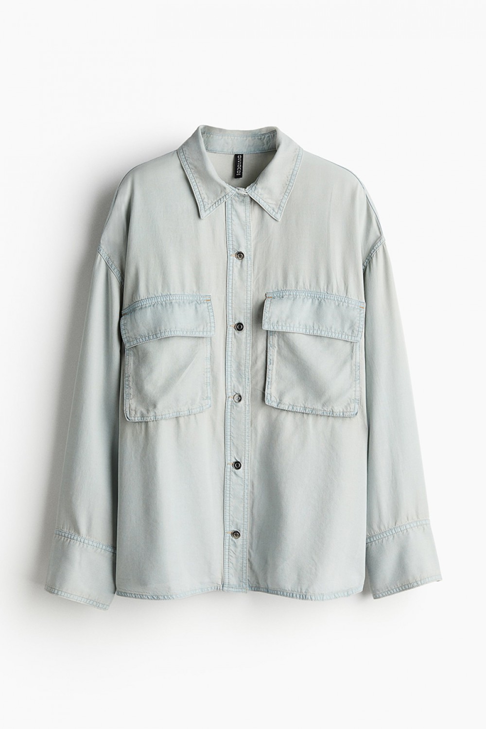 Oversized shirt in soft lyocell denim. Collar, buttons at front, bellows chest pockets with flap, and a yoke at back. Heavily dropped shoulders, long sleeves, wide cuffs with button. Gently rounded hem.