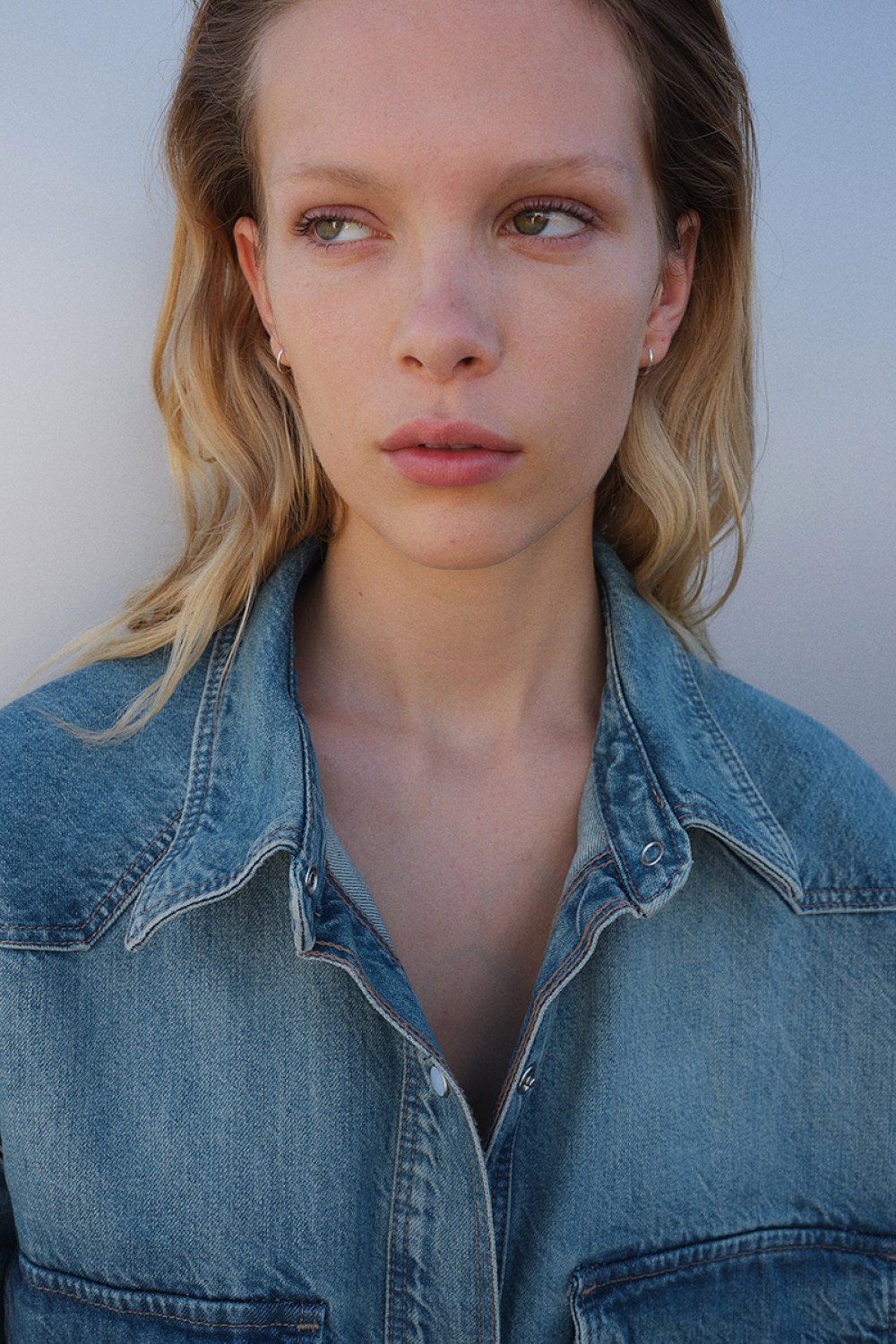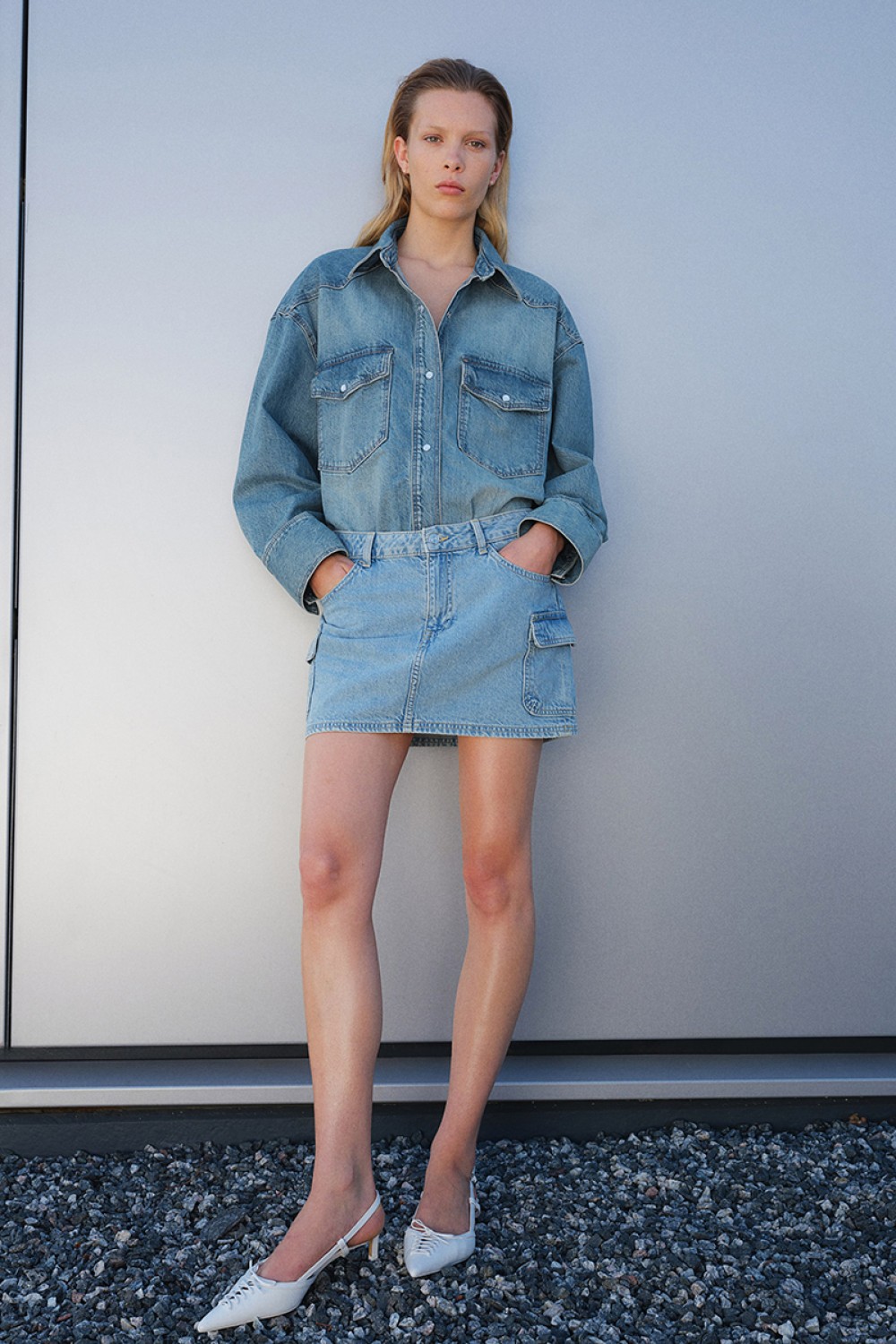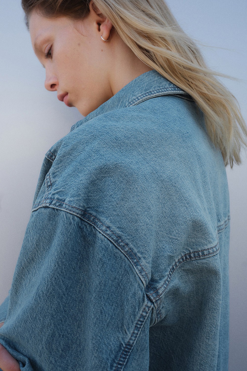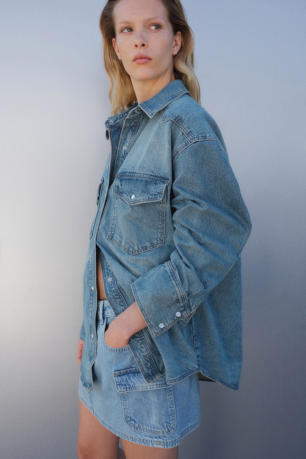 Oversized, western-inspired shirt in rigid cotton denim. Collar, snap fasteners at front, chest pockets with flap and a snap fastener, and a yoke at back. Dropped shoulders and long sleeves with snap fastener at cuffs. Gently rounded hem.