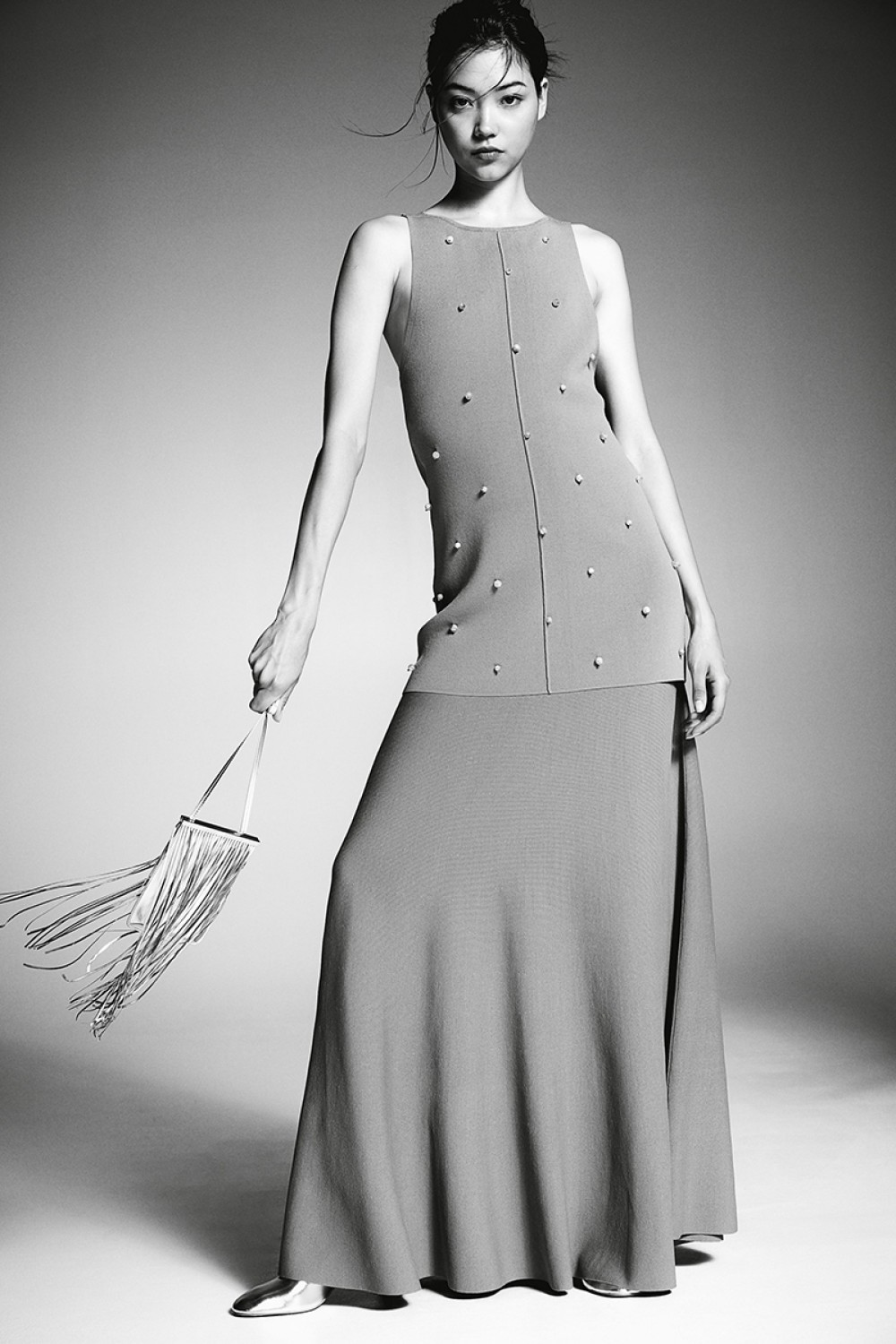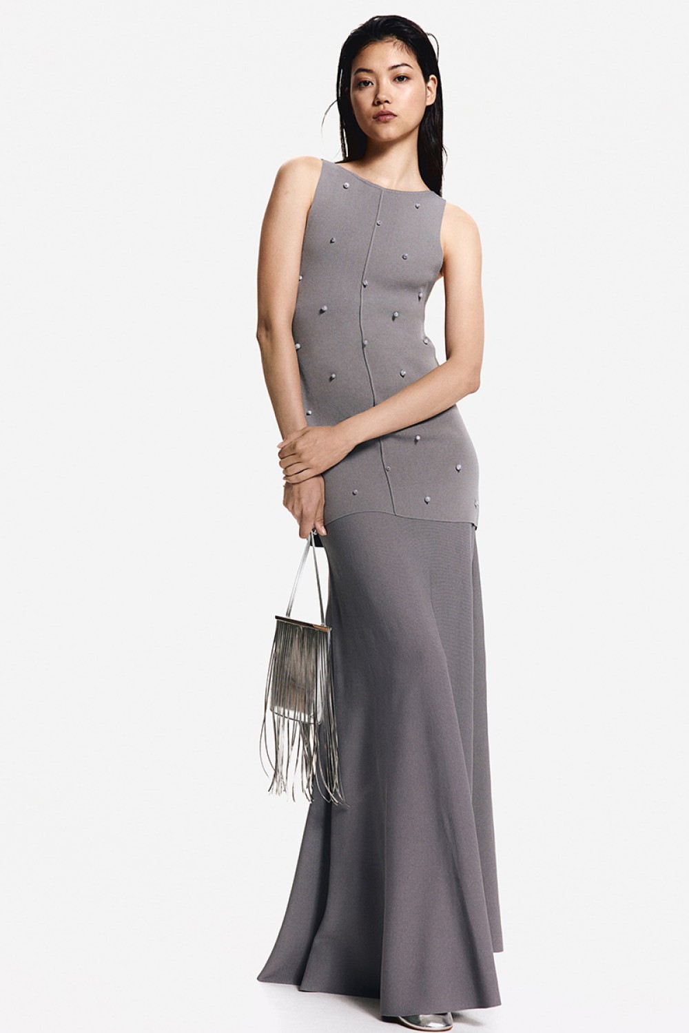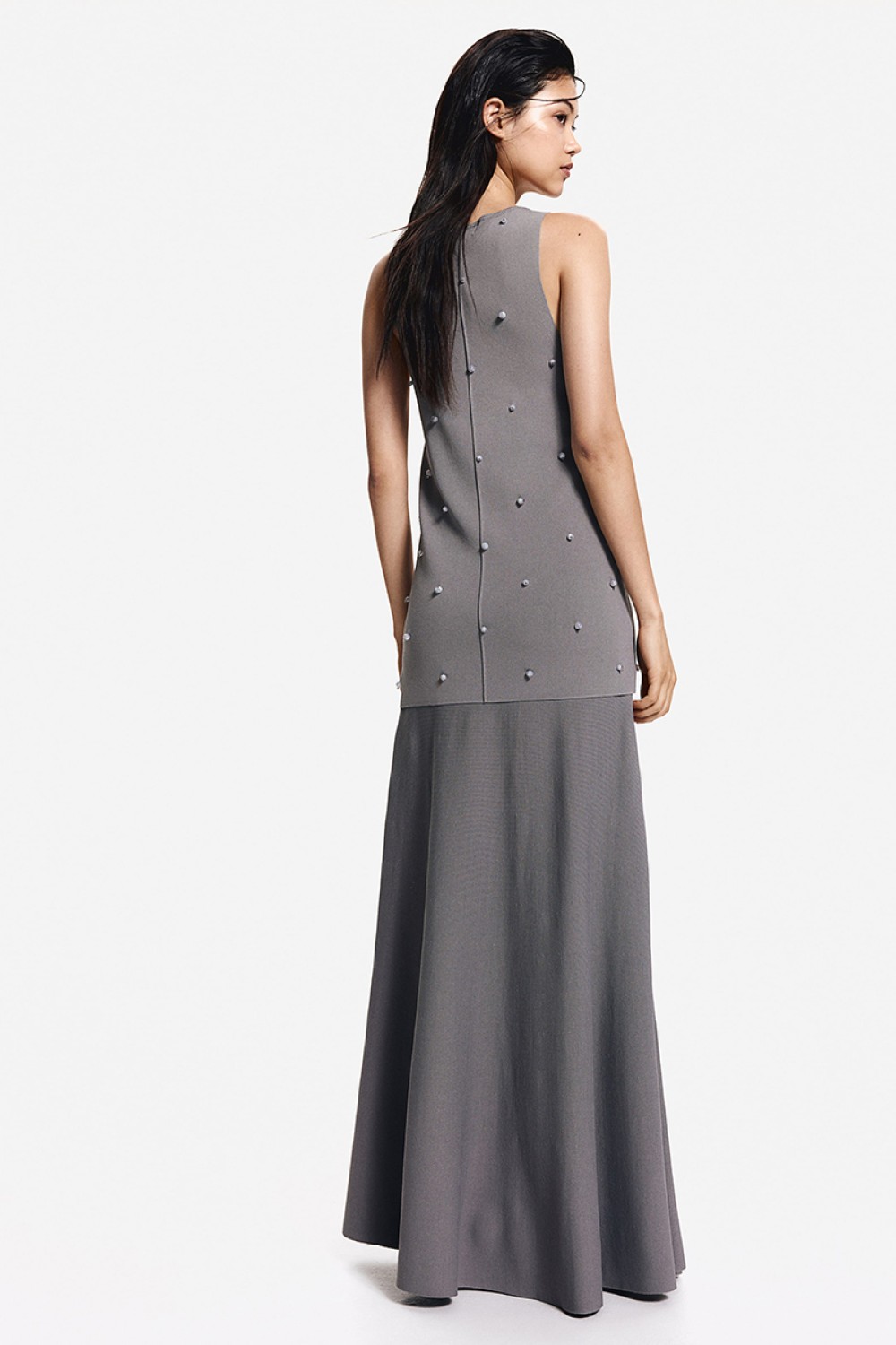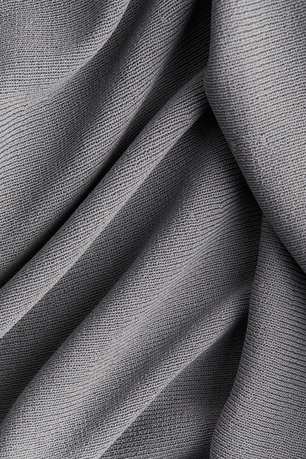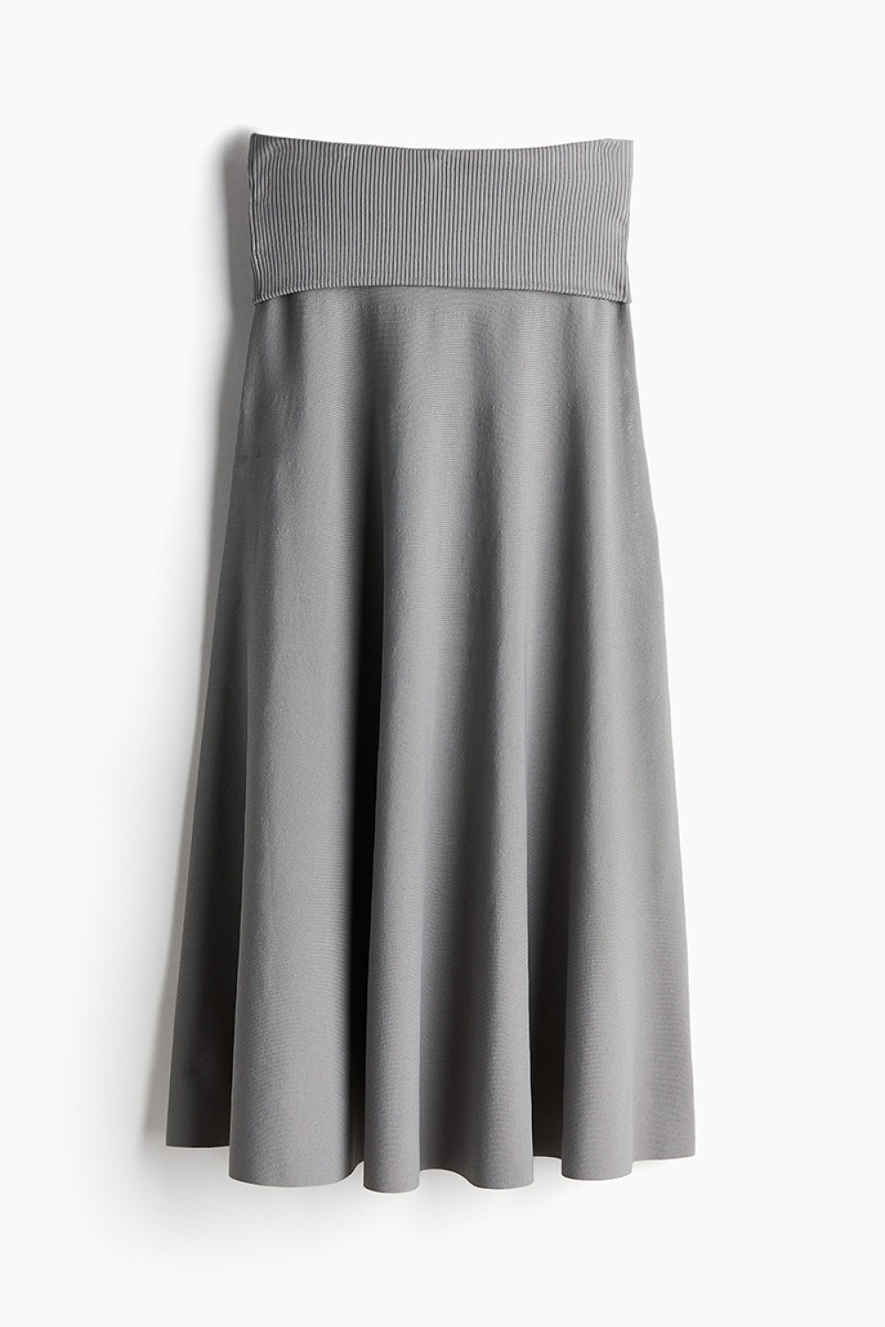 Flared, ankle-length fine-knit skirt with visible stitching at front and back. Wide, elasticized foldover waistband.