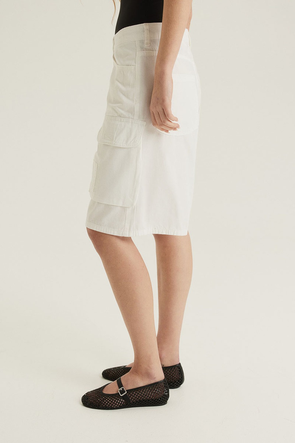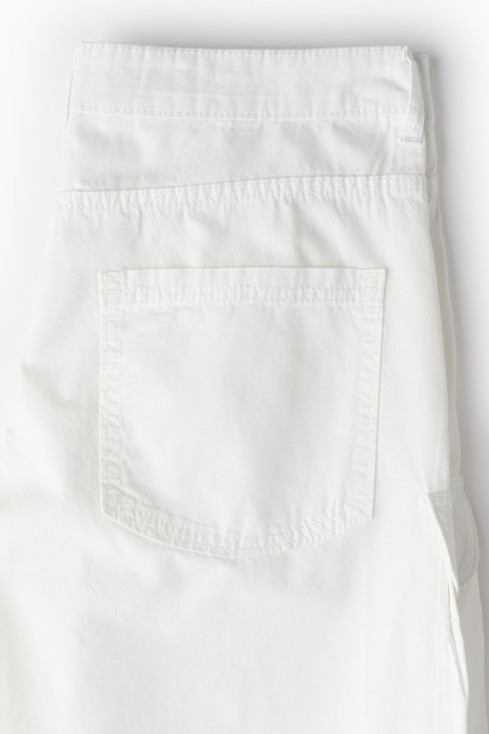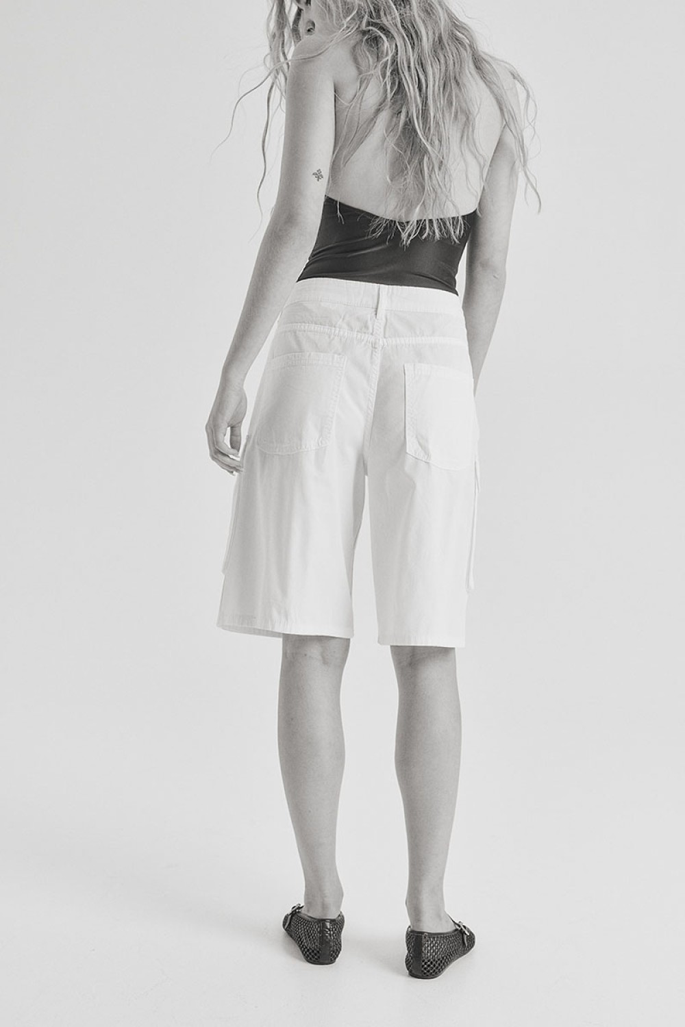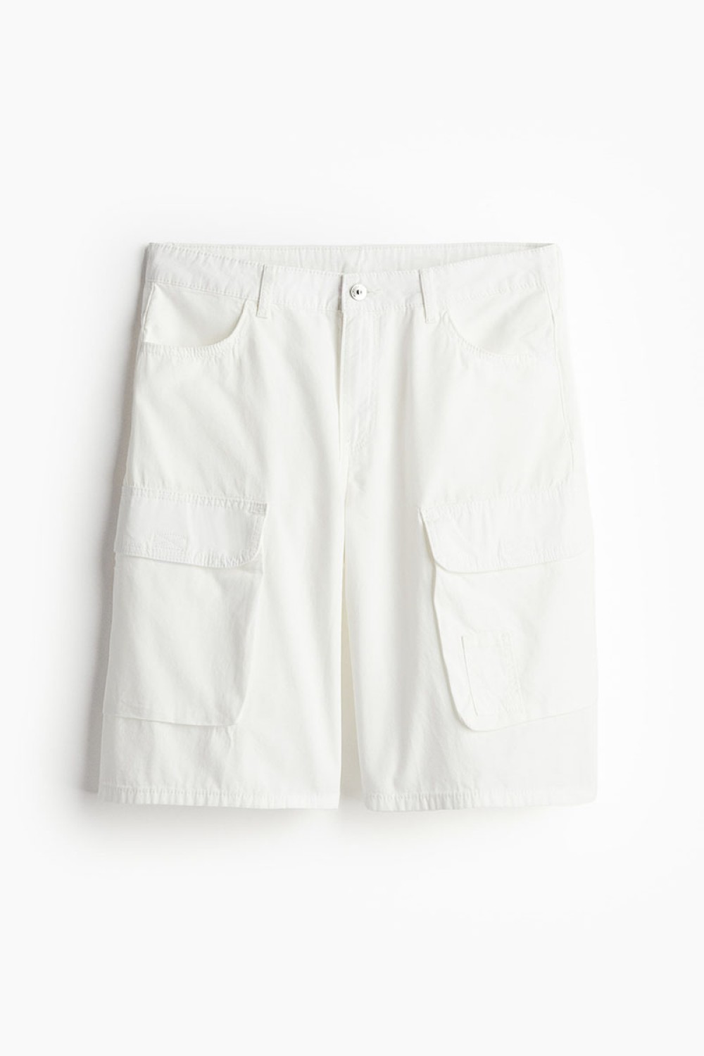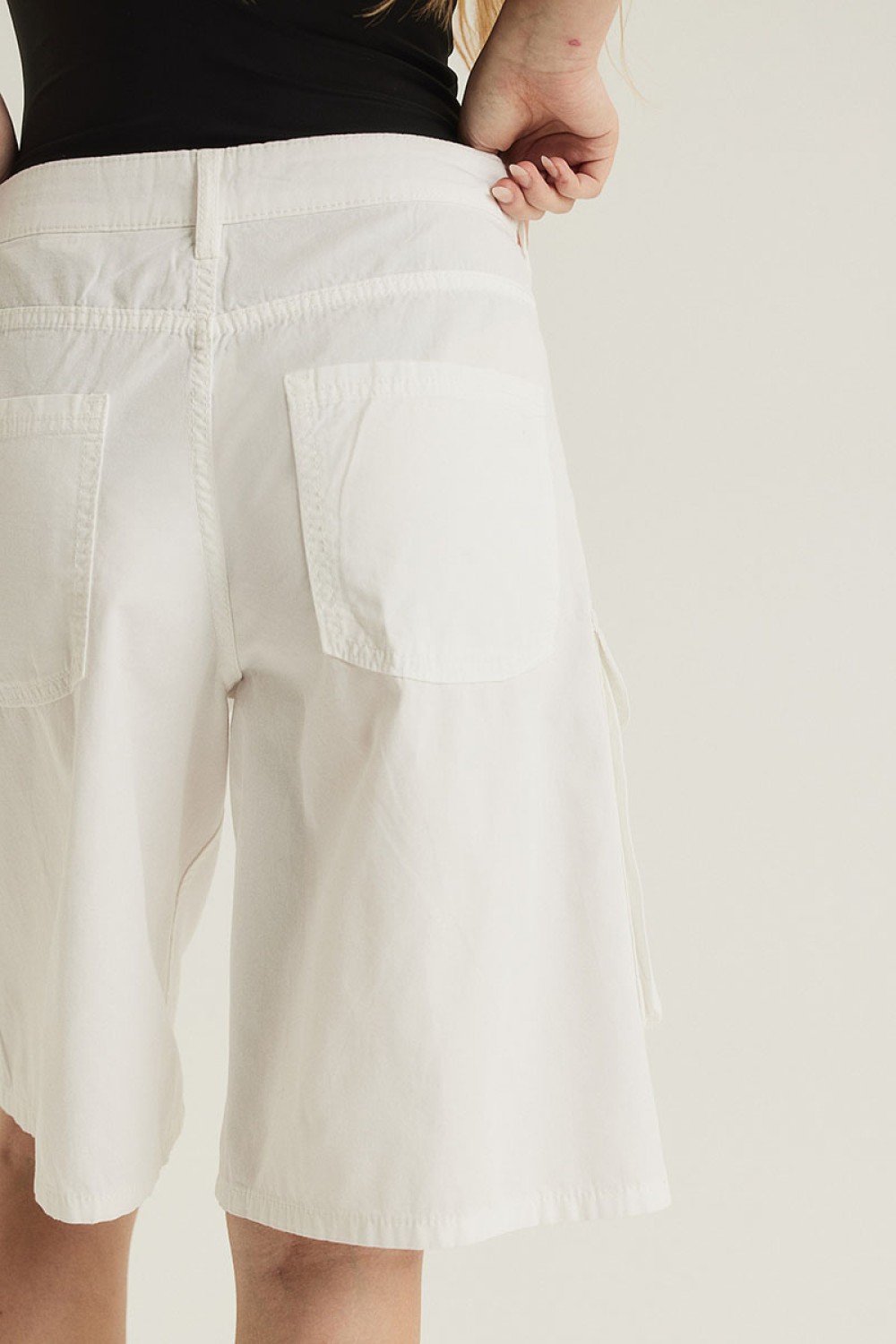 Knee-length shorts in cotton canvas. Low waist and zip fly with button. Front pockets, back pockets, and bellows leg pockets with flap and hook-loop fastener. One of the leg pockets with a small, outer patch pocket.
