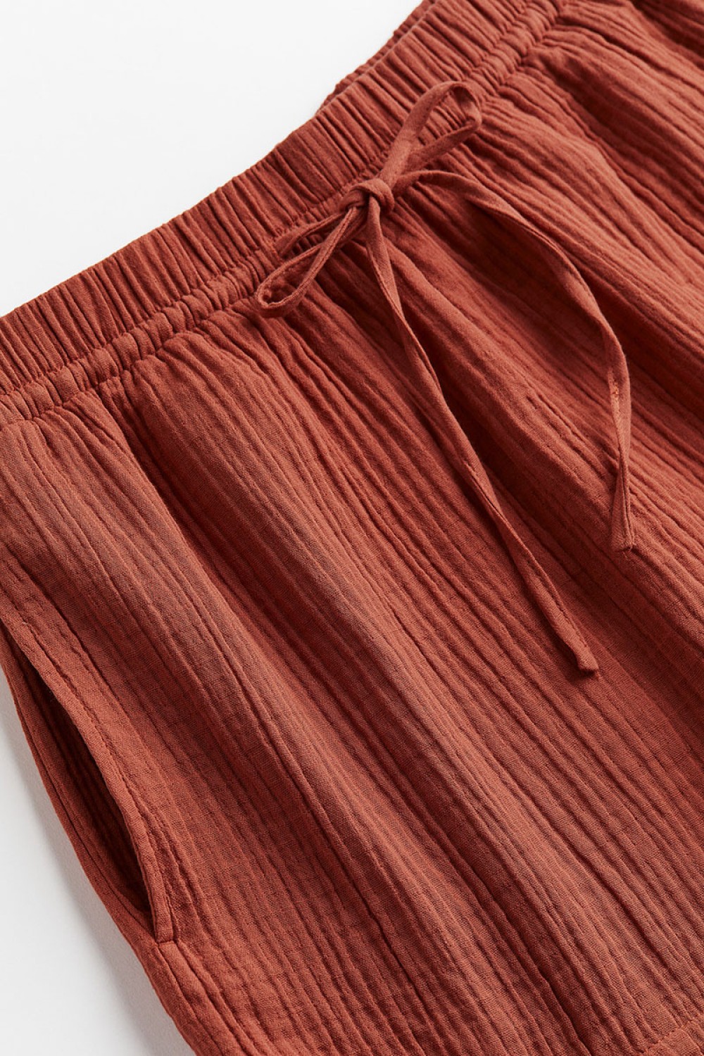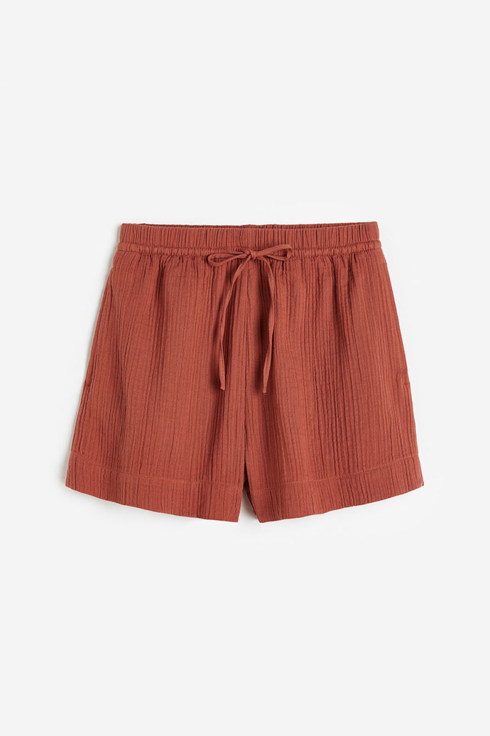 Loose-fit shorts in woven, crinkled cotton fabric. High waist, elasticized, drawstring waistband, and discreet side pockets. Short slit at sides of hems.
