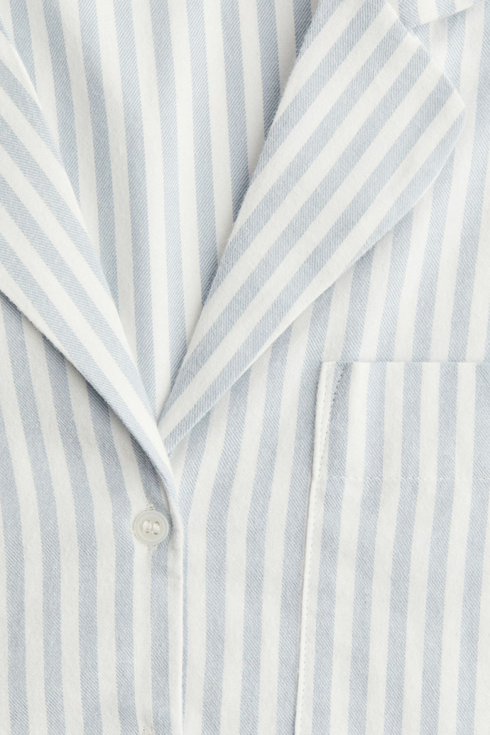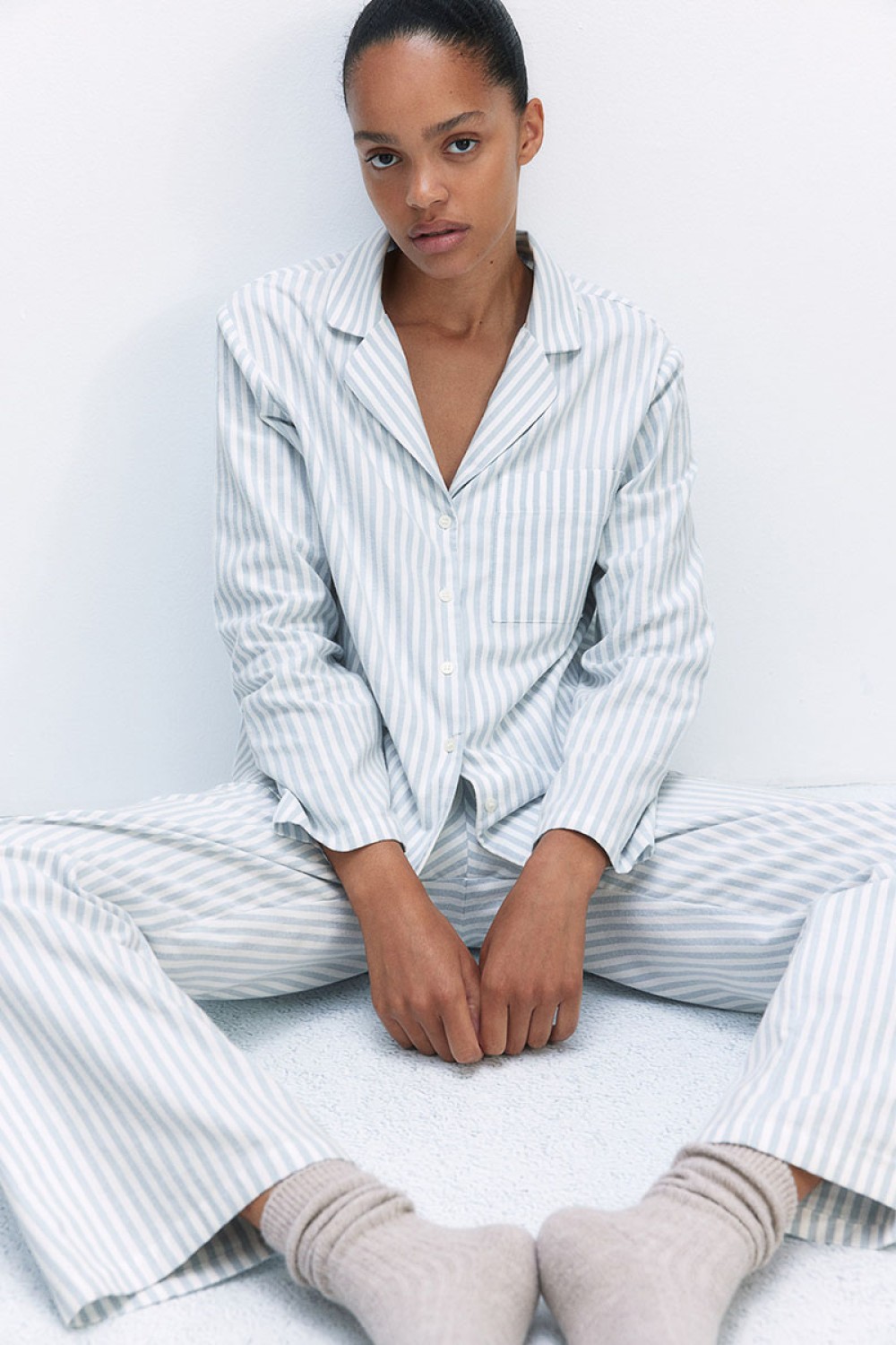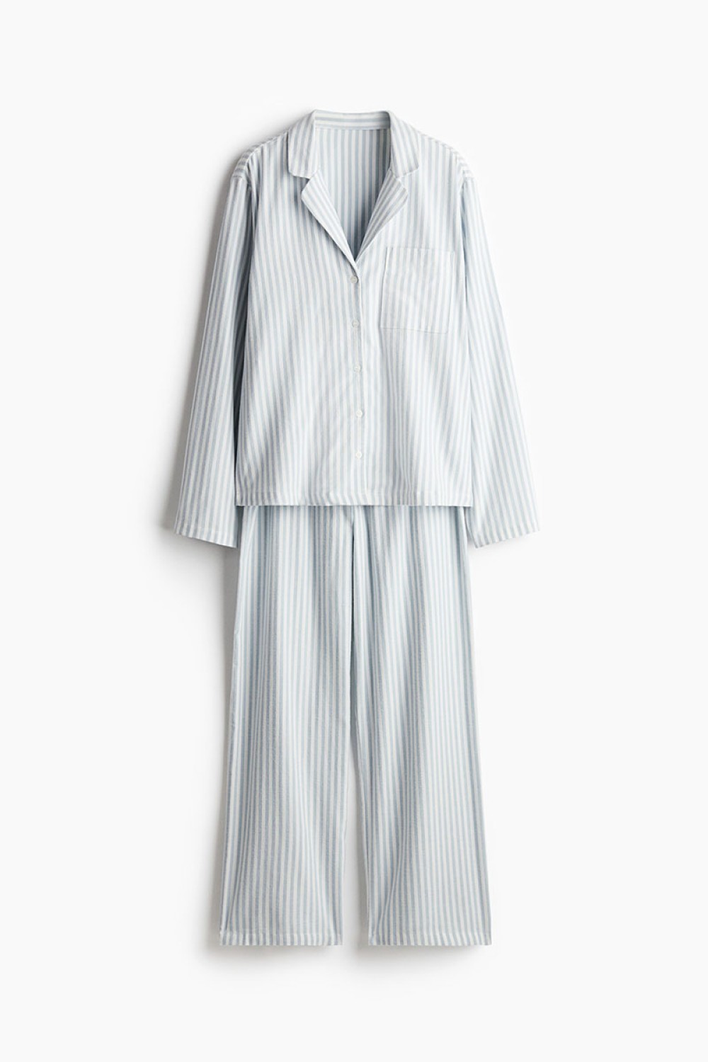 Pajamas in soft cotton twill with a shirt and pants. Long-sleeved shirt with a resort collar, buttons at front, and a patch chest pocket. Pants with an elasticized, drawstring waistband.