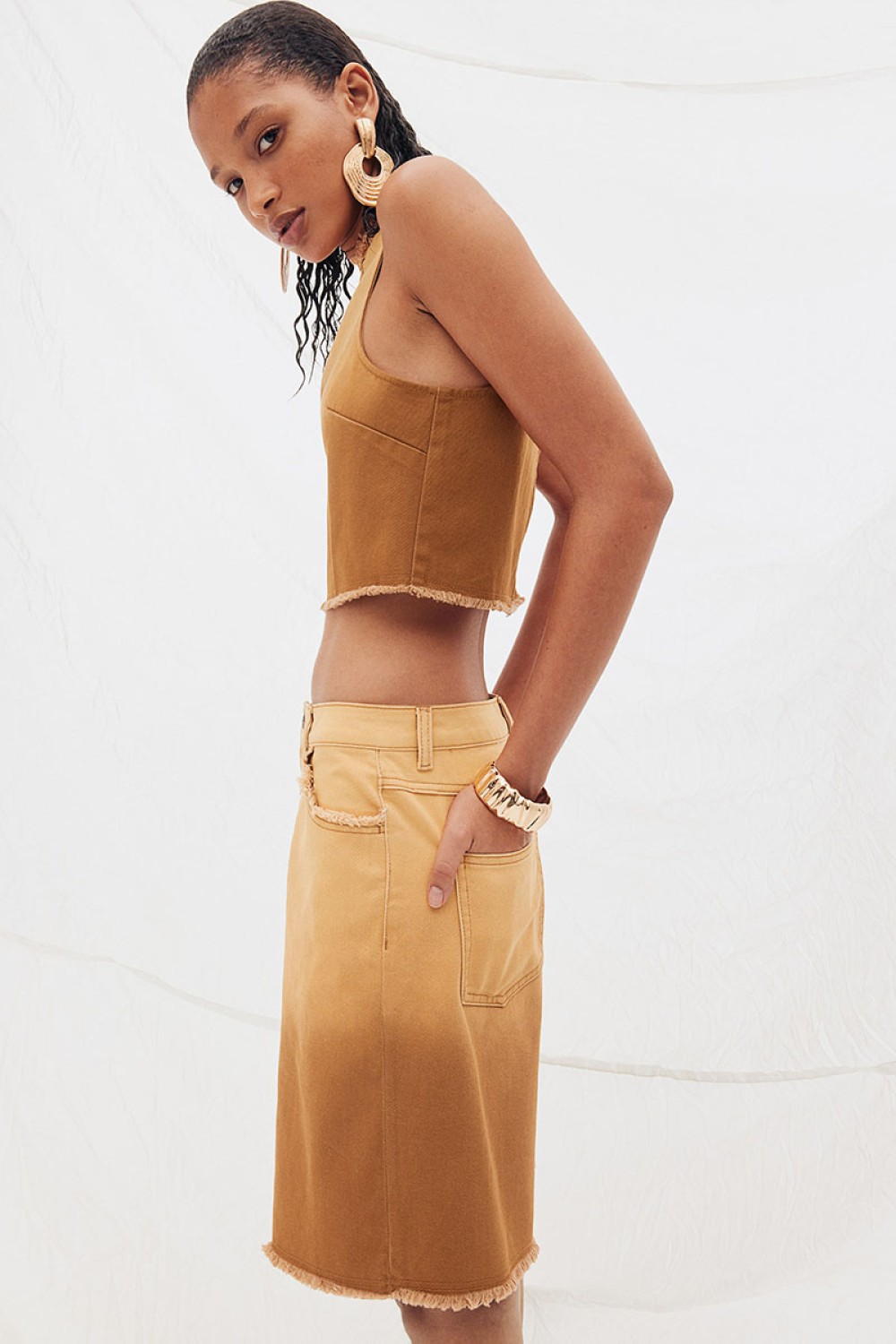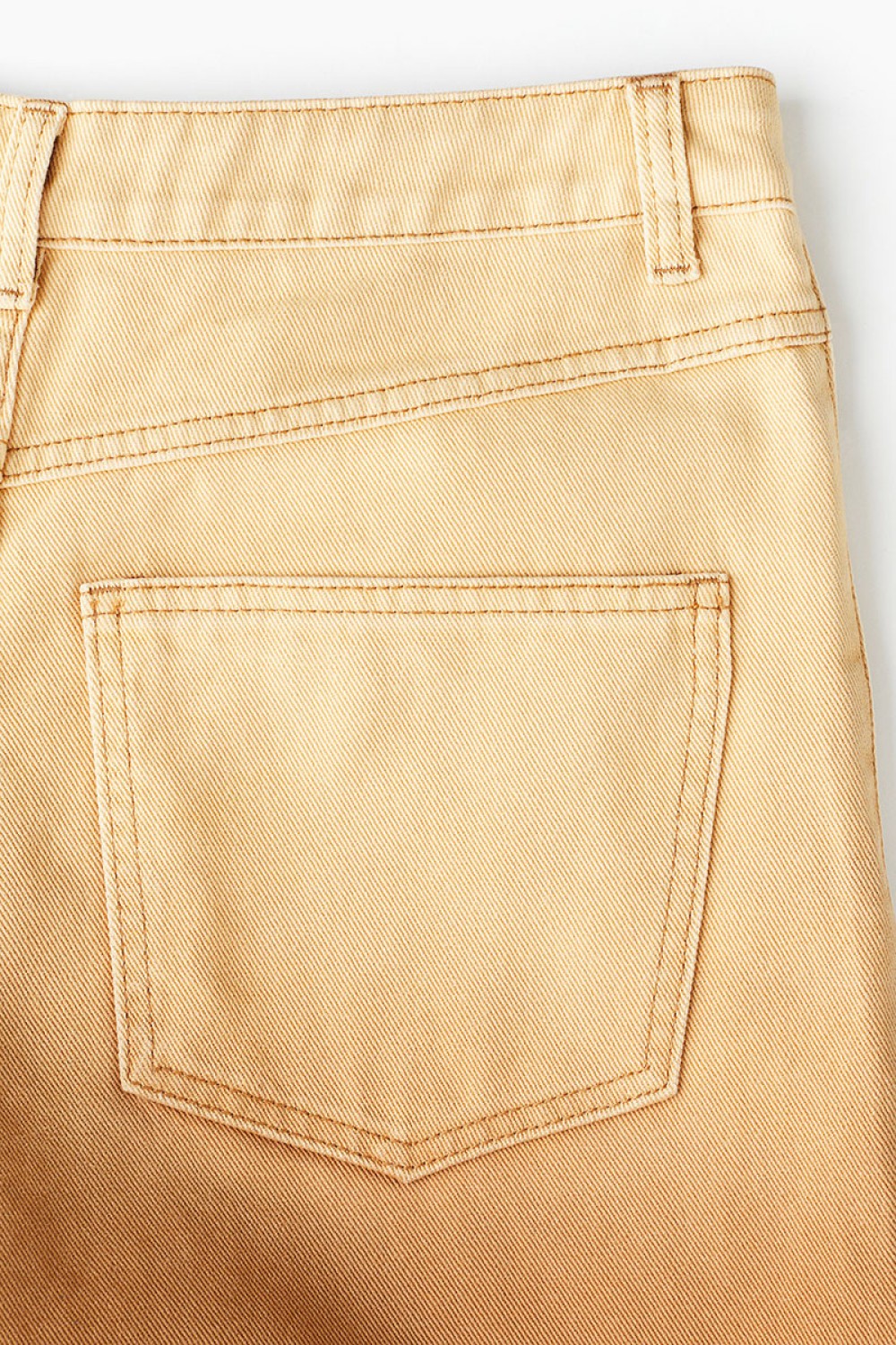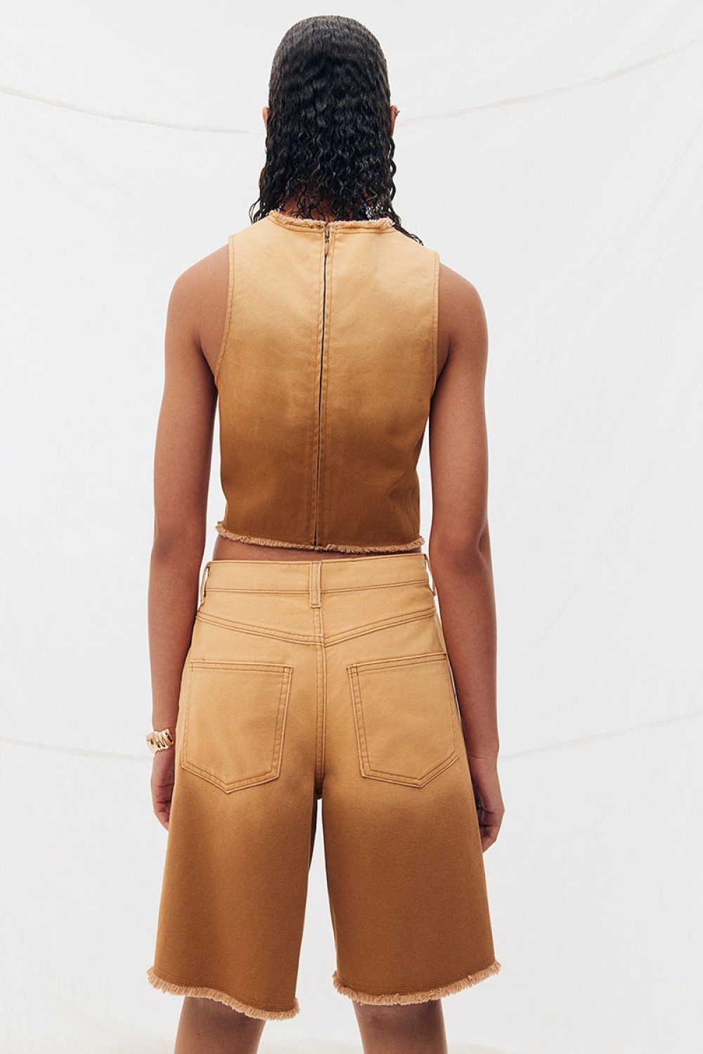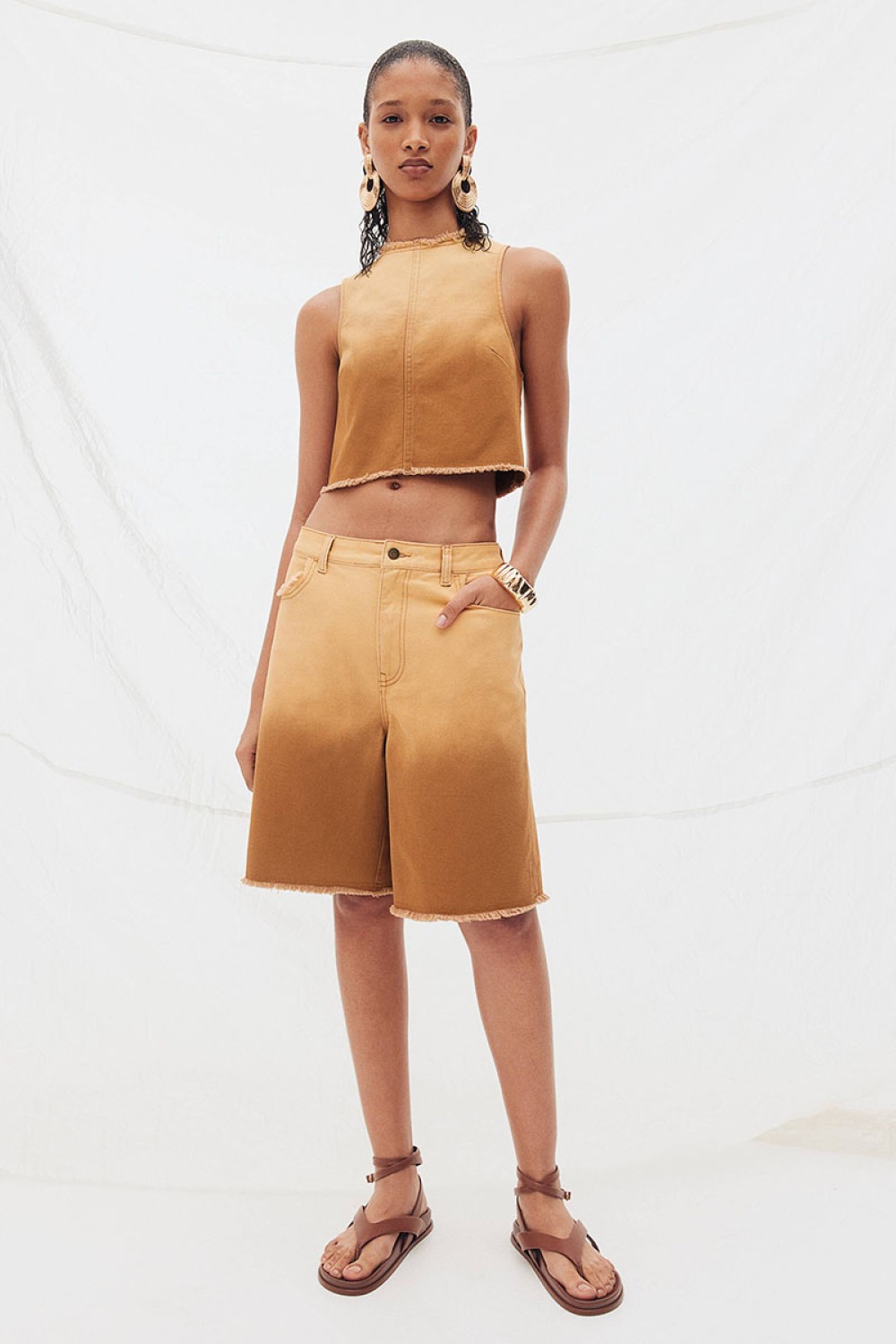 Loose-fit, knee-length shorts in cotton twill. Regular waist, zip fly with button, and dropped gusset. Front pockets, back pockets, and frayed edges at pocket openings and hems.