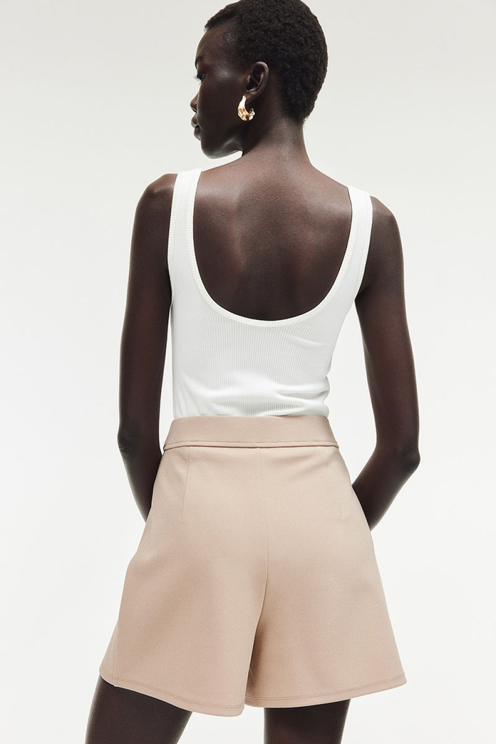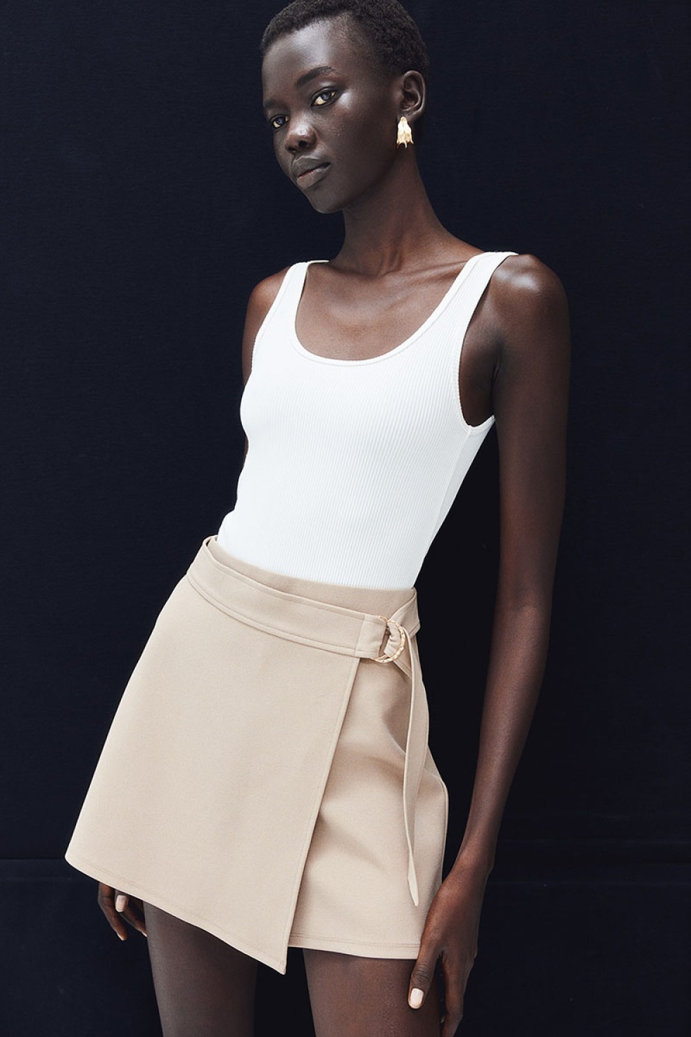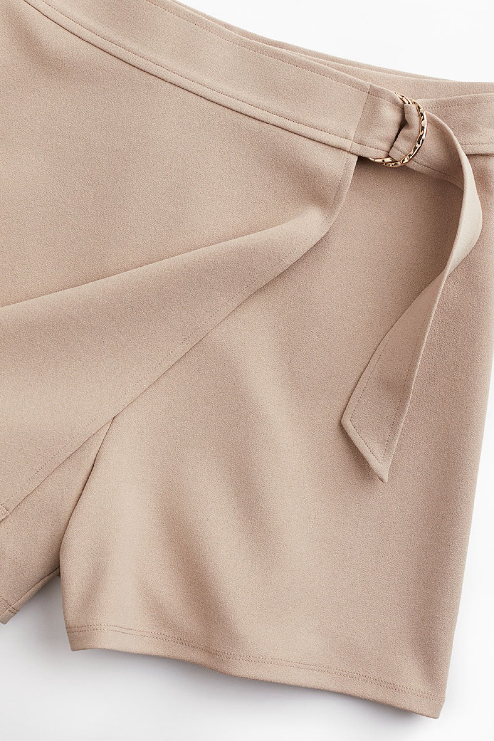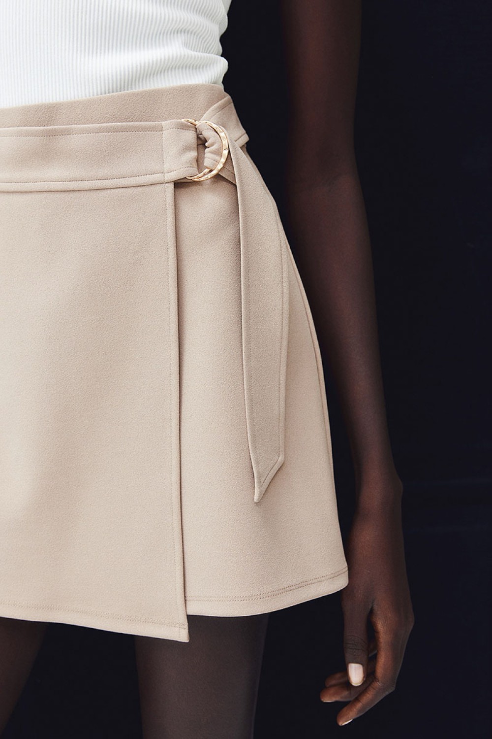 Skort in soft jersey. High waist, elasticized waistband, and wrapover front with attached belt with metal D-rings at one side.