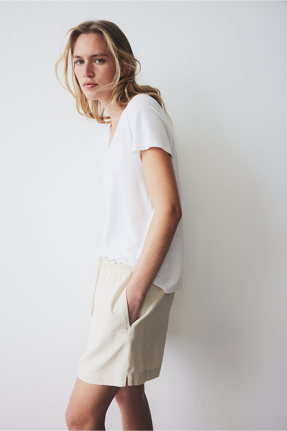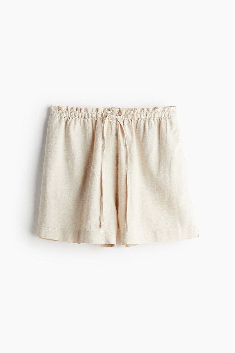Shorts in an airy, woven linen blend. High, ruffle-trimmed waist, narrow drawstring and covered elastic at waistband, and discreet side pockets.