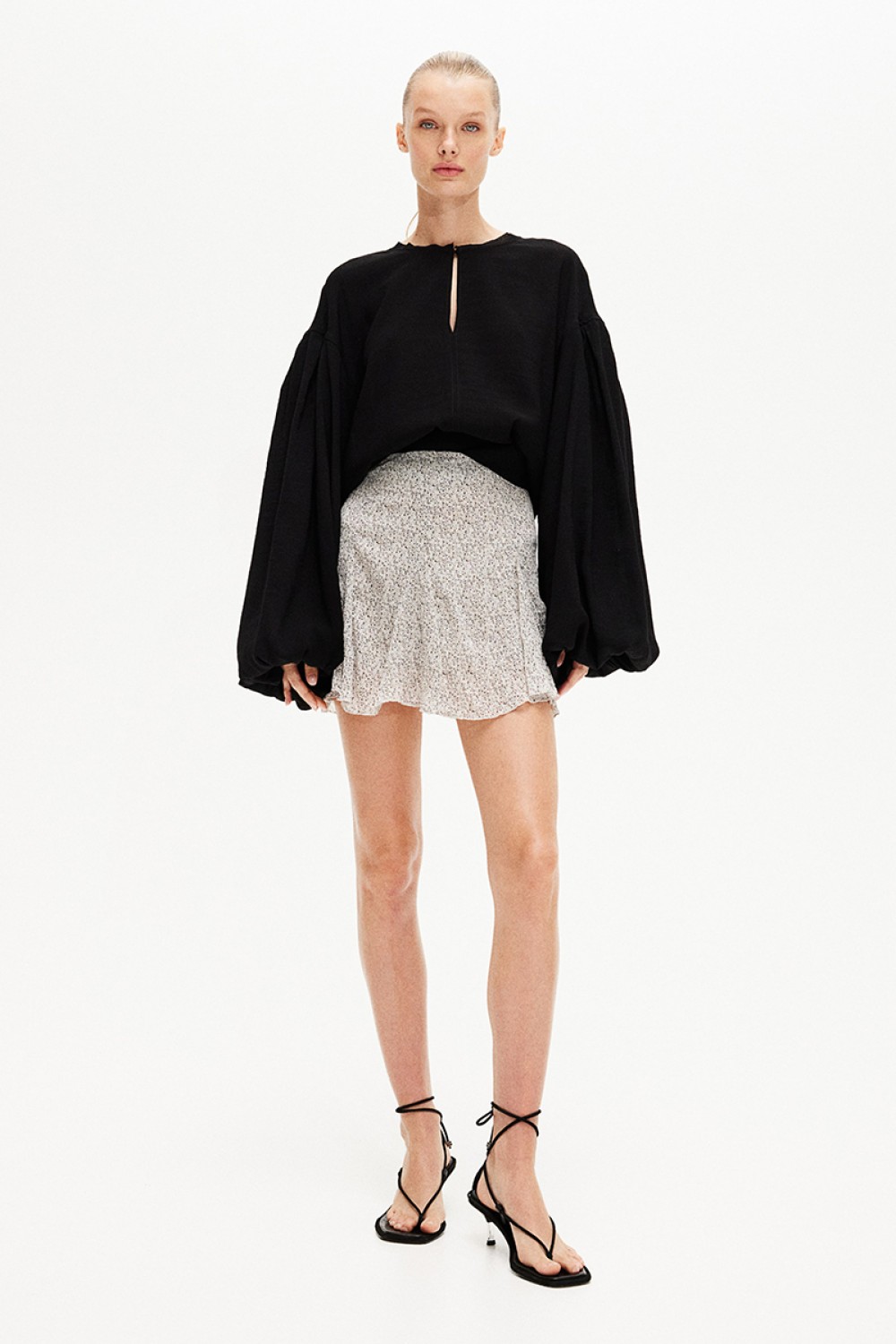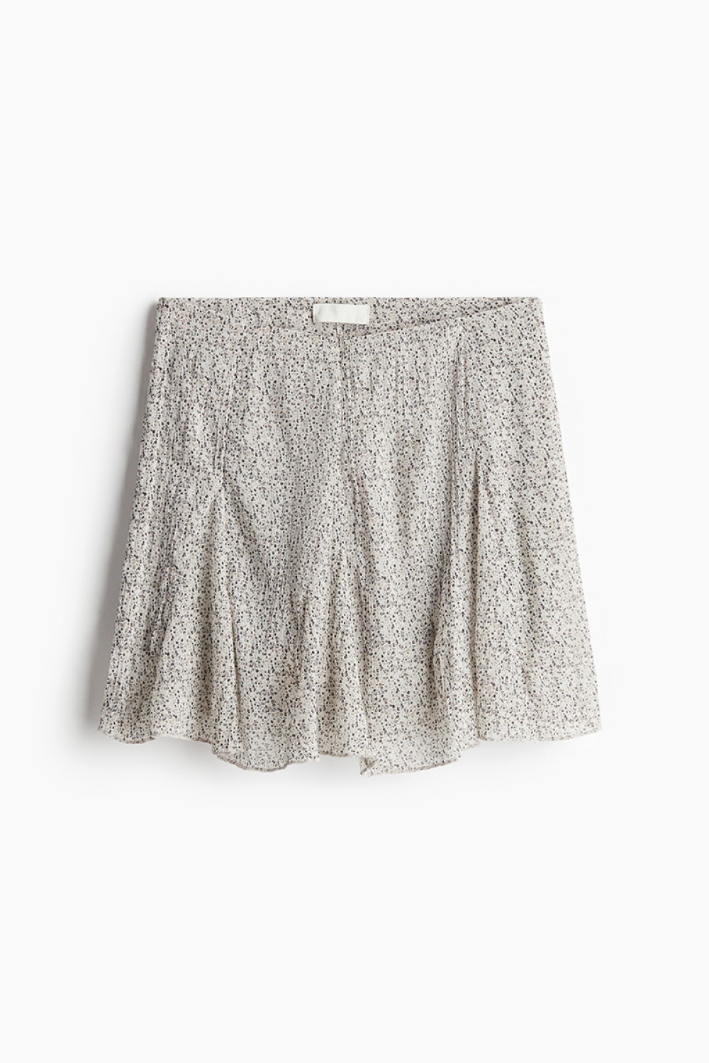Short skirt in woven crepe fabric. High waist, concealed zipper at one side, and insets at hem for a flared silhouette. Liner shorts.