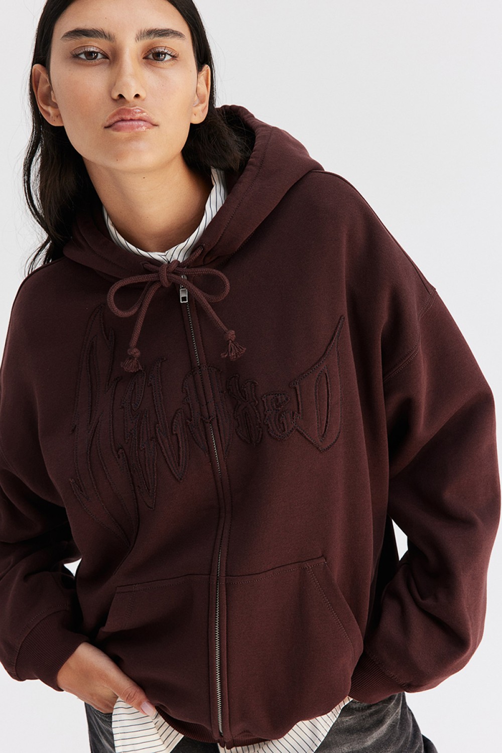 Oversized hooded sweatshirt jacket with a soft, brushed inside. Double-layered, drawstring hood, zipper at front, and kangaroo pockets. Heavily dropped shoulders, long sleeves, and ribbing at cuffs and hem.