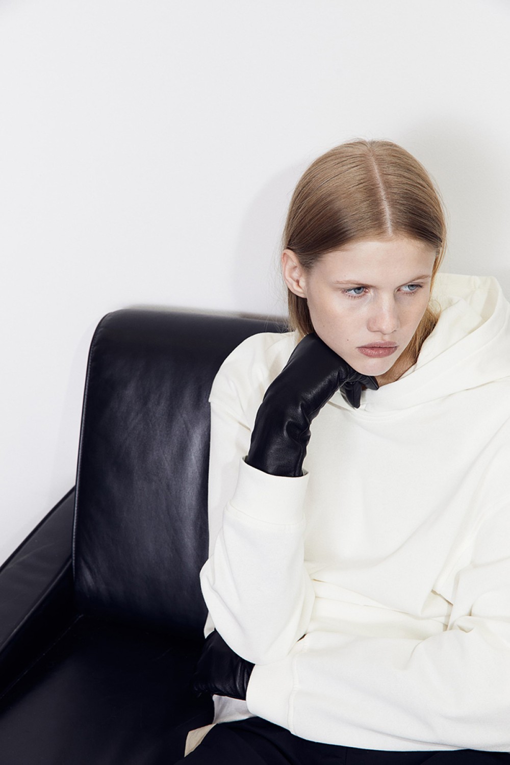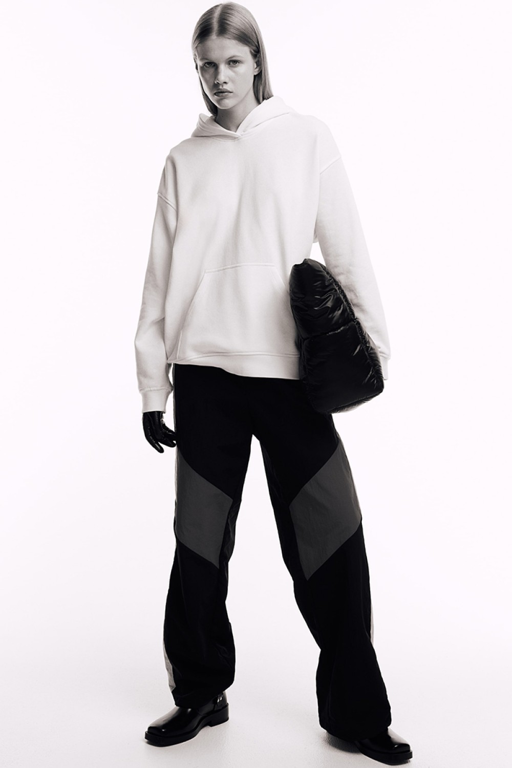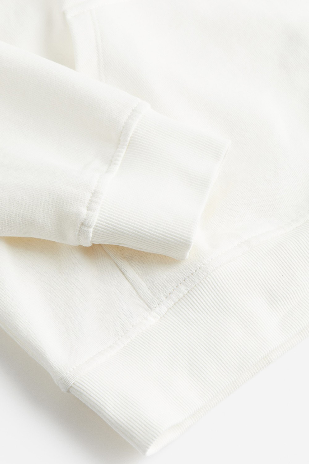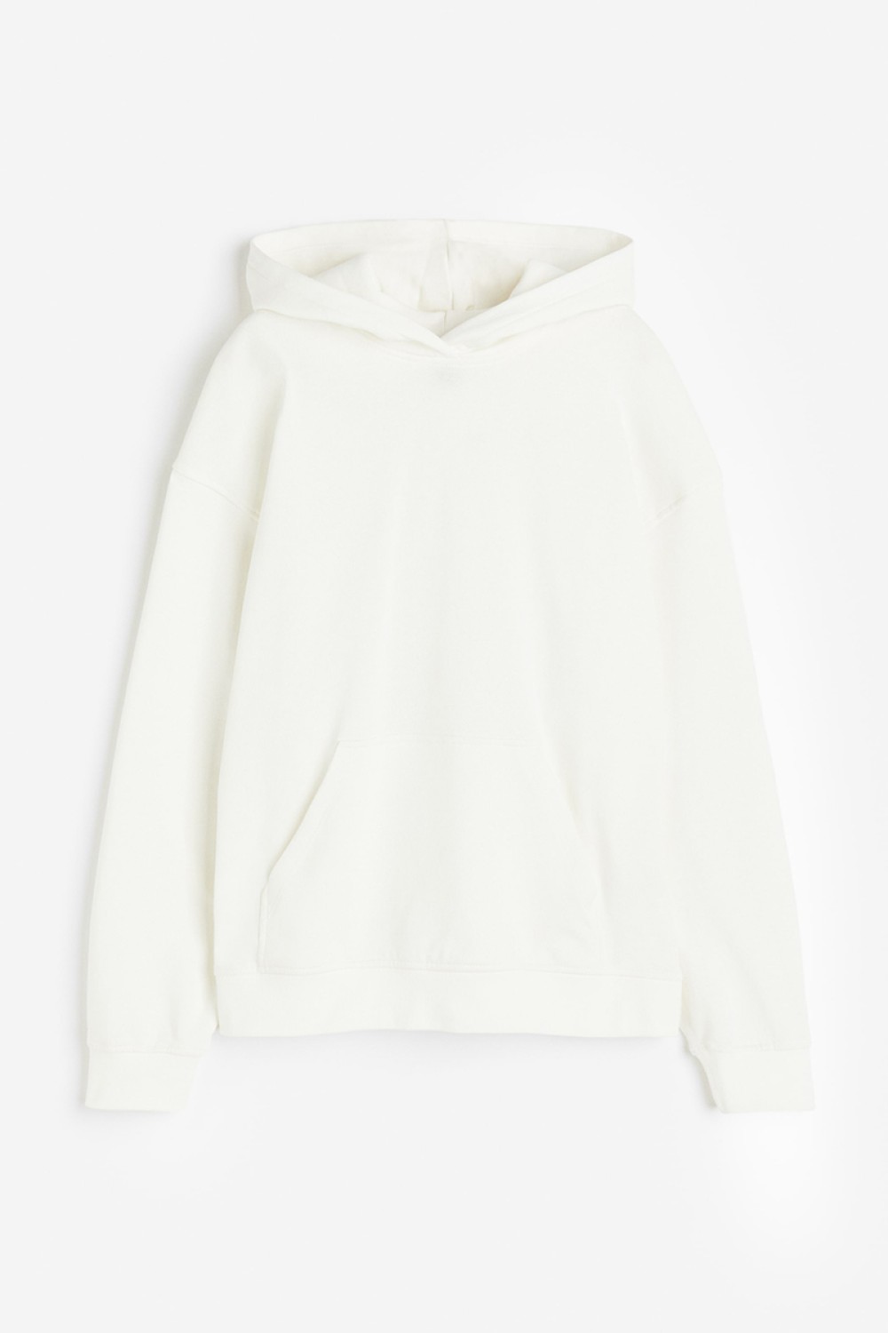 Oversized sweatshirt hoodie with soft, brushed inside. Double-layered, wrapover hood, kangaroo pocket, dropped shoulders, and long sleeves. Ribbing at cuffs and hem.