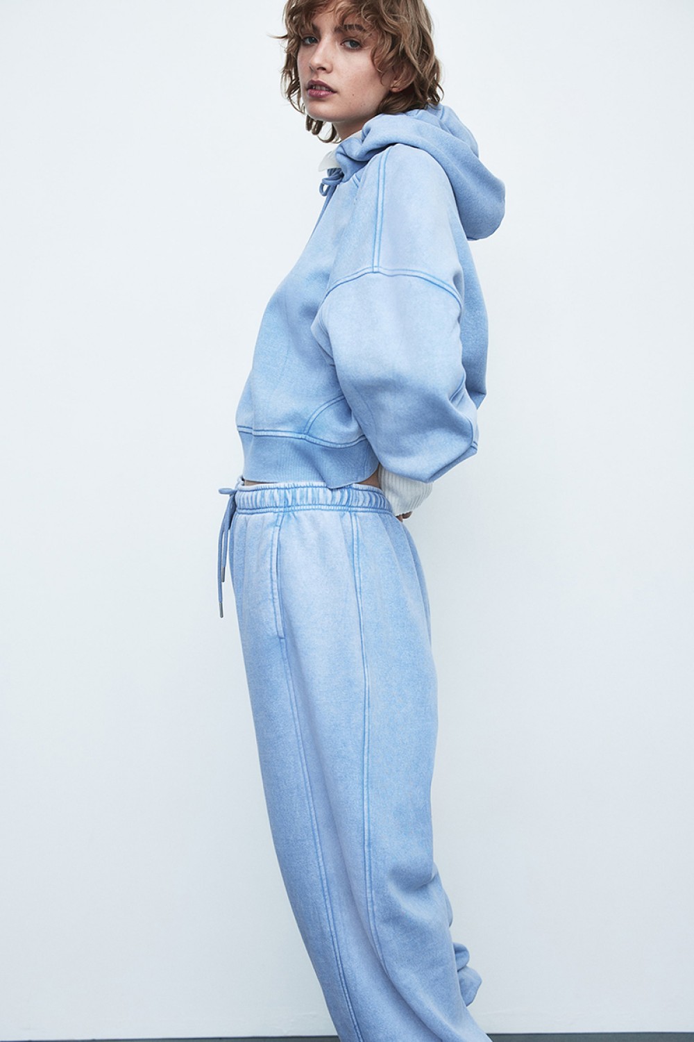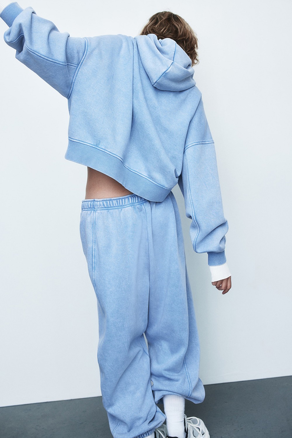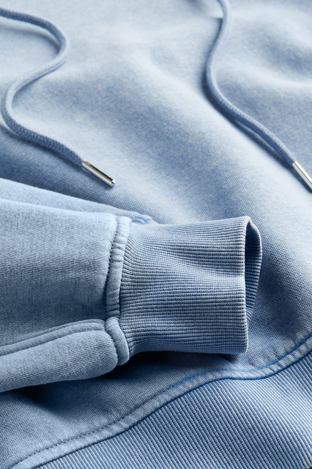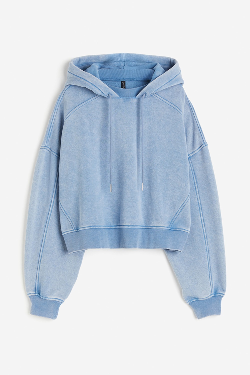 Short, oversized, washed-look sweatshirt hoodie with soft, brushed inside. Double-layered hood, crew neck, heavily dropped shoulders, and long sleeves. Ribbing at neck, cuffs, and hem.