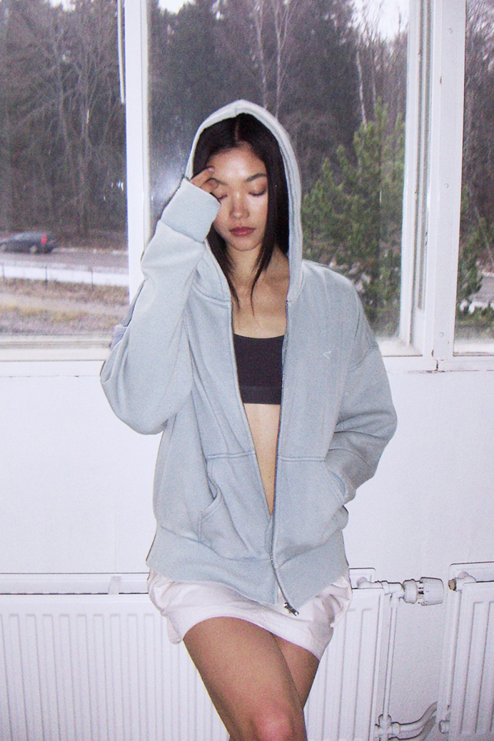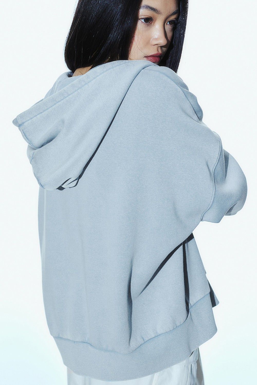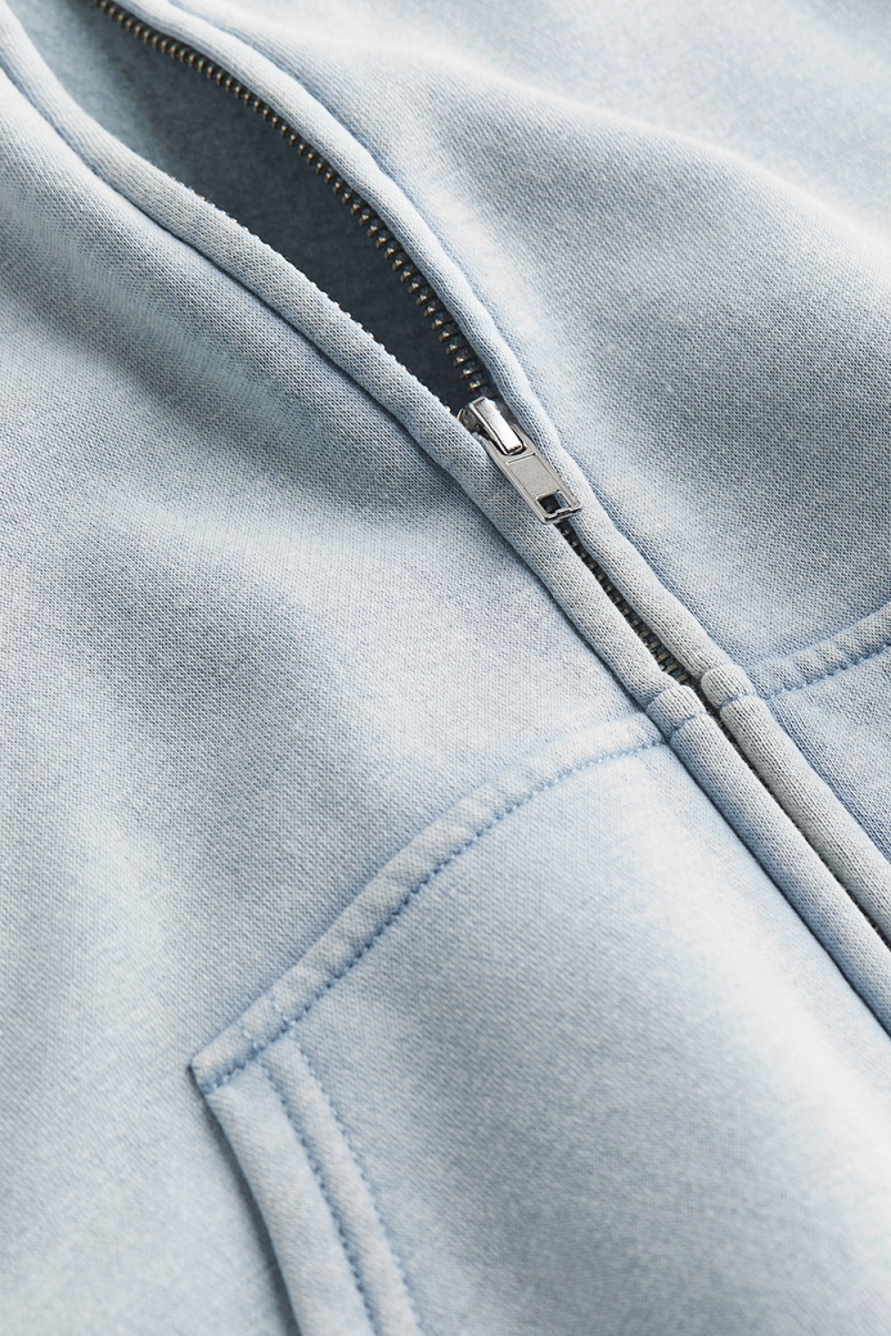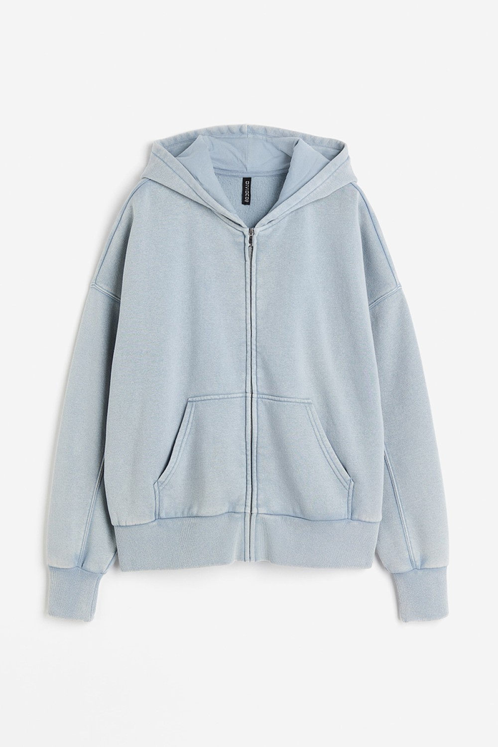 Oversized hooded sweatshirt jacket with soft, brushed inside. Jersey-lined hood, concealed zipper at front, and kangaroo pockets. Heavily dropped shoulders, long sleeves, and ribbing at cuffs and hem.