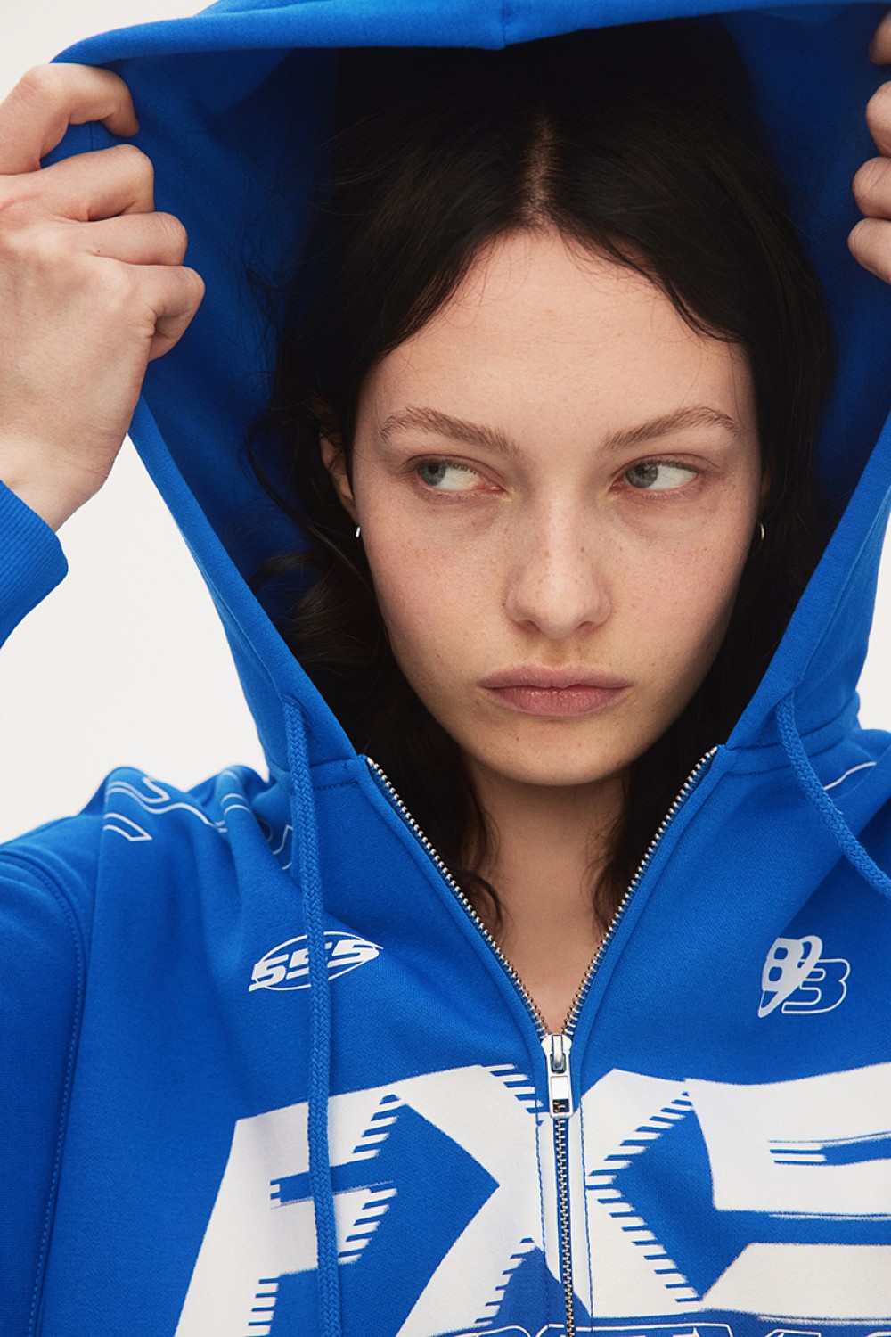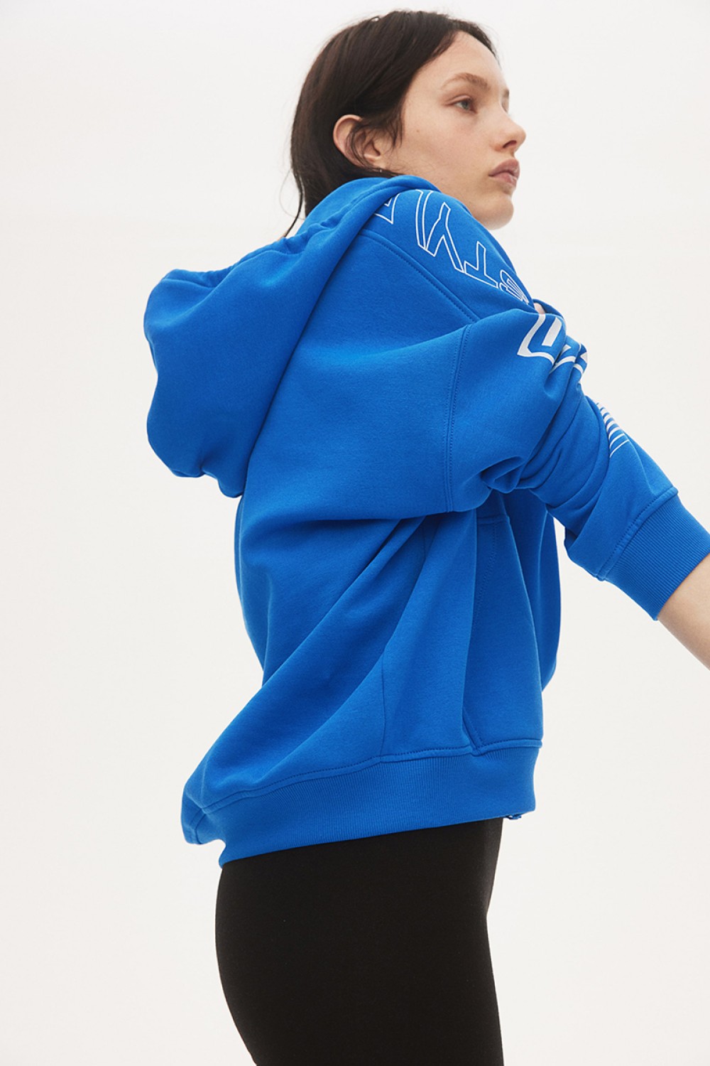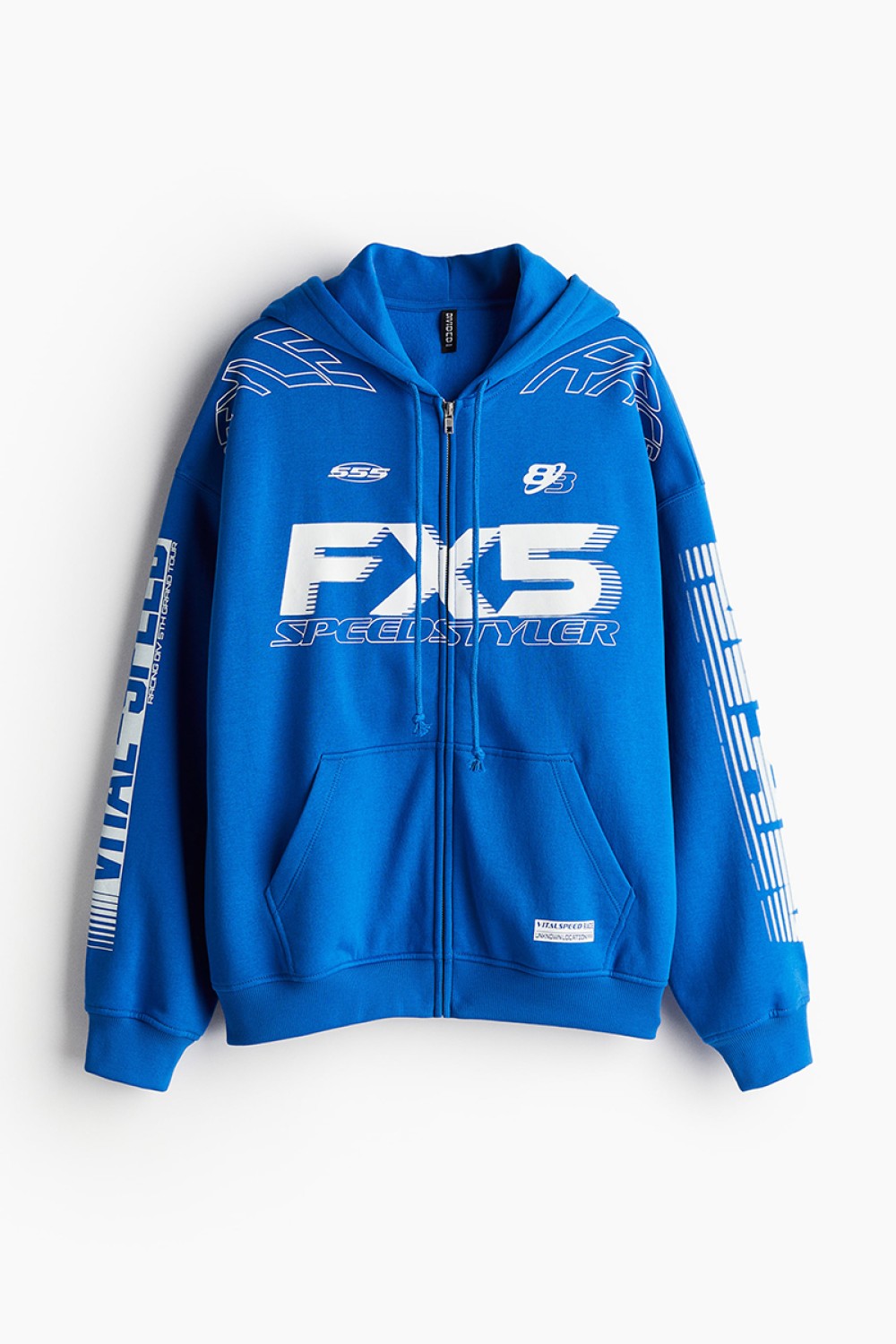 Oversized hooded sweatshirt jacket with a soft, brushed inside. Double-layered, drawstring hood, zipper at front, and kangaroo pockets. Heavily dropped shoulders, long sleeves, and ribbing at cuffs and hem.