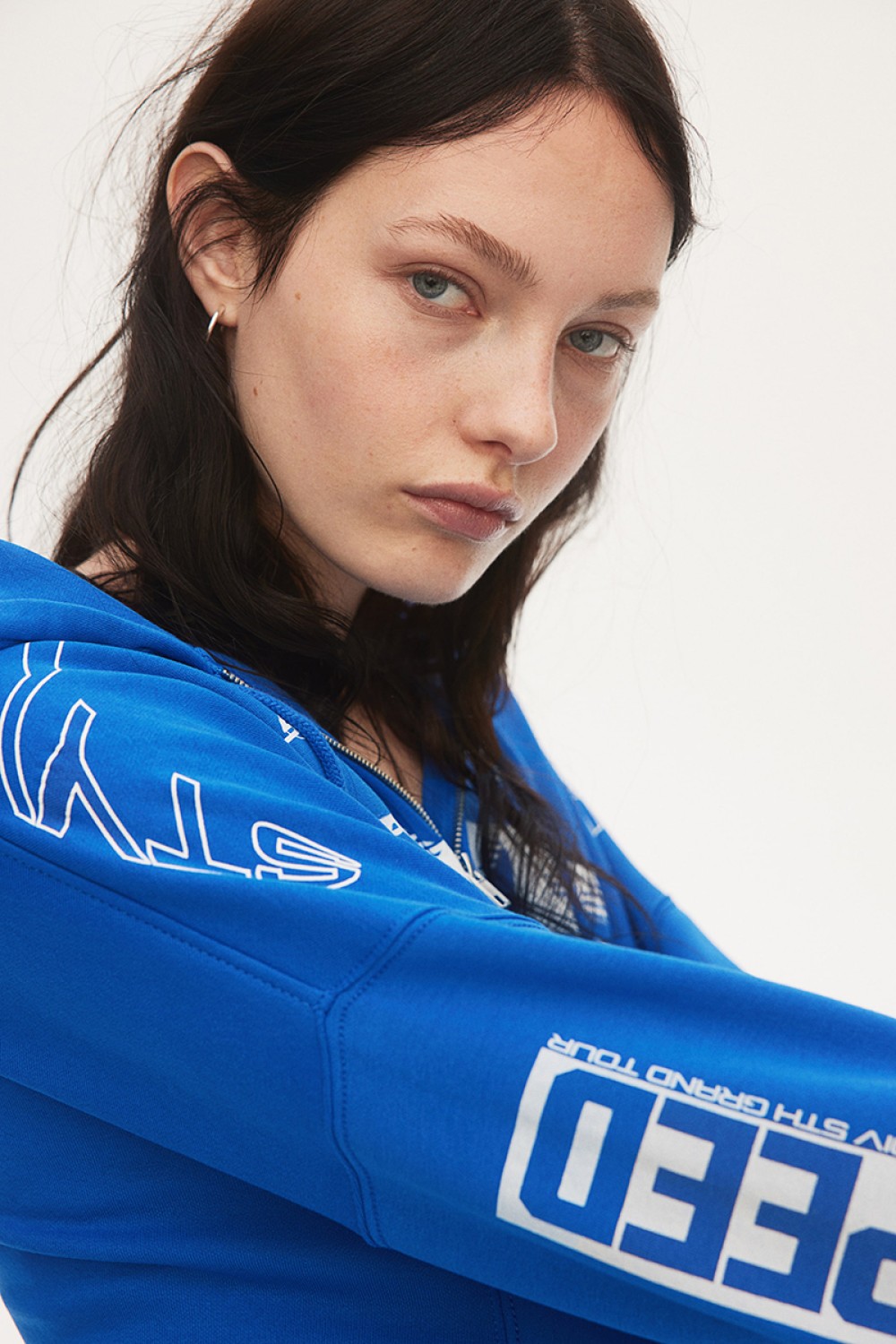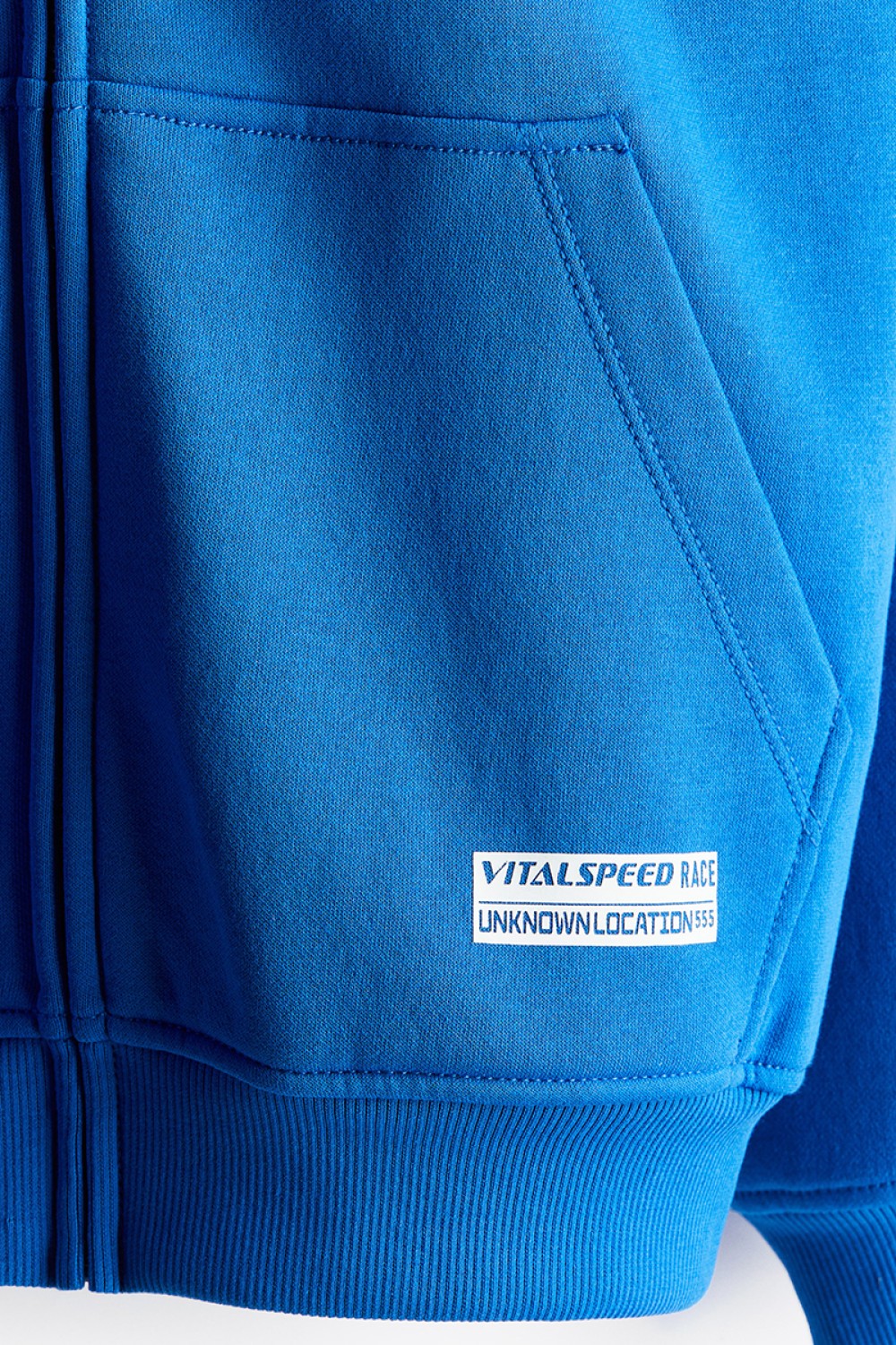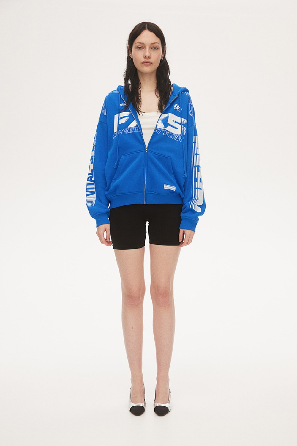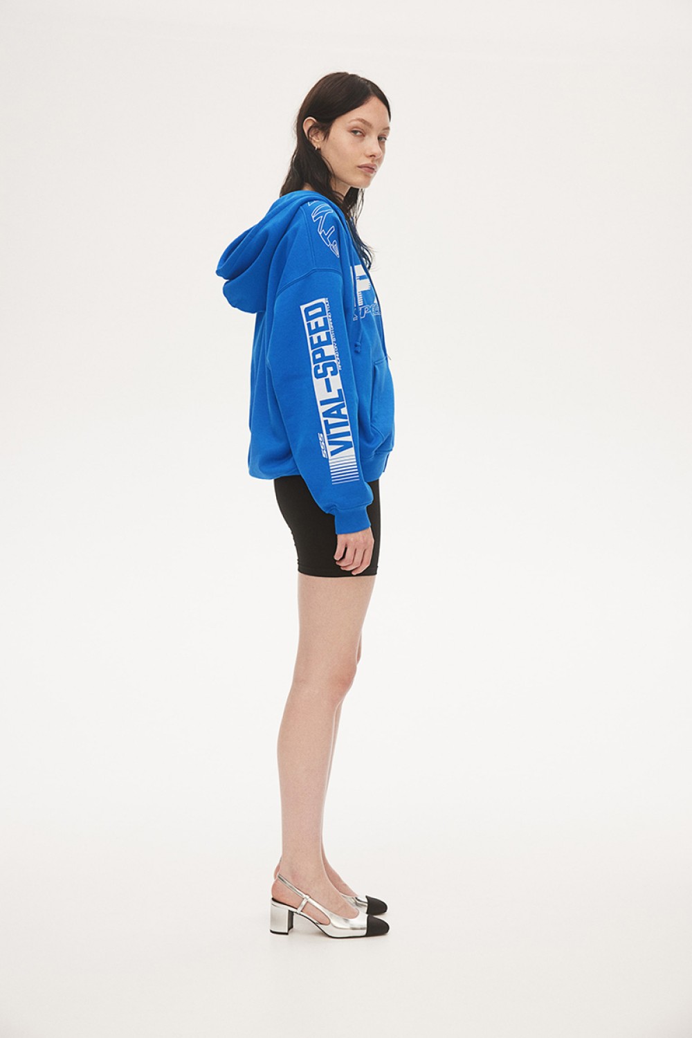 Oversized hooded sweatshirt jacket with a soft, brushed inside. Double-layered, drawstring hood, zipper at front, and kangaroo pockets. Heavily dropped shoulders, long sleeves, and ribbing at cuffs and hem.