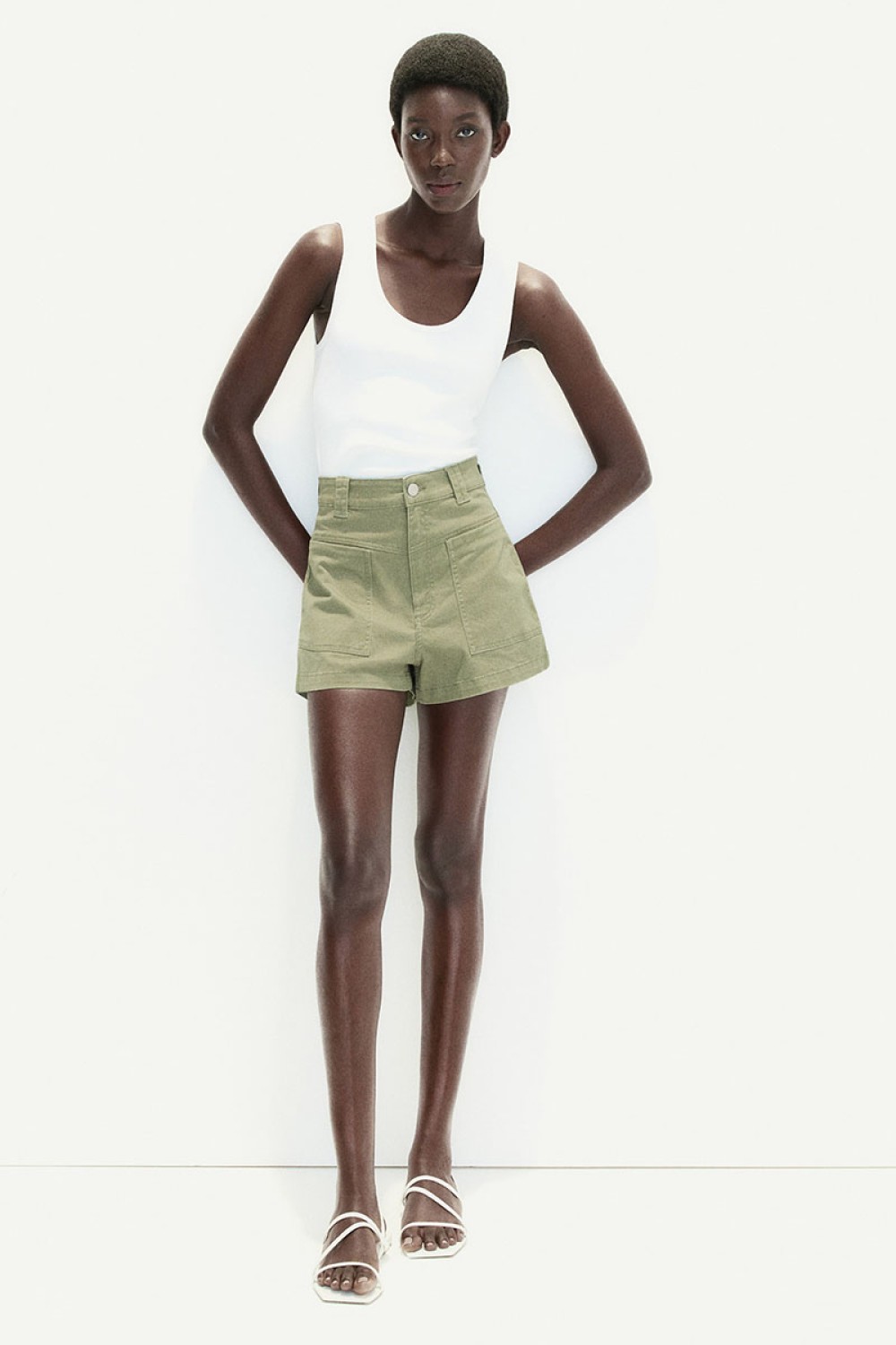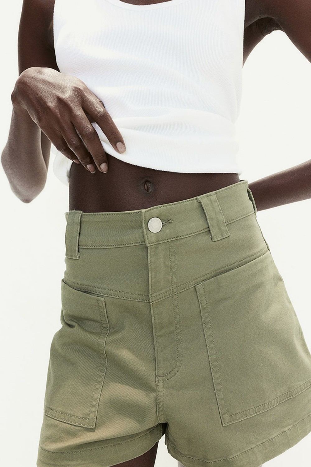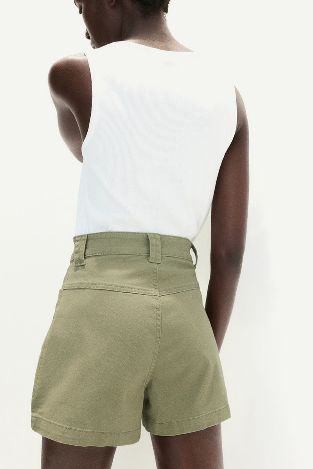 Fitted shorts in cotton twill with a V-shaped yoke at front and back. High waist, zip fly with button, and patch front pockets.