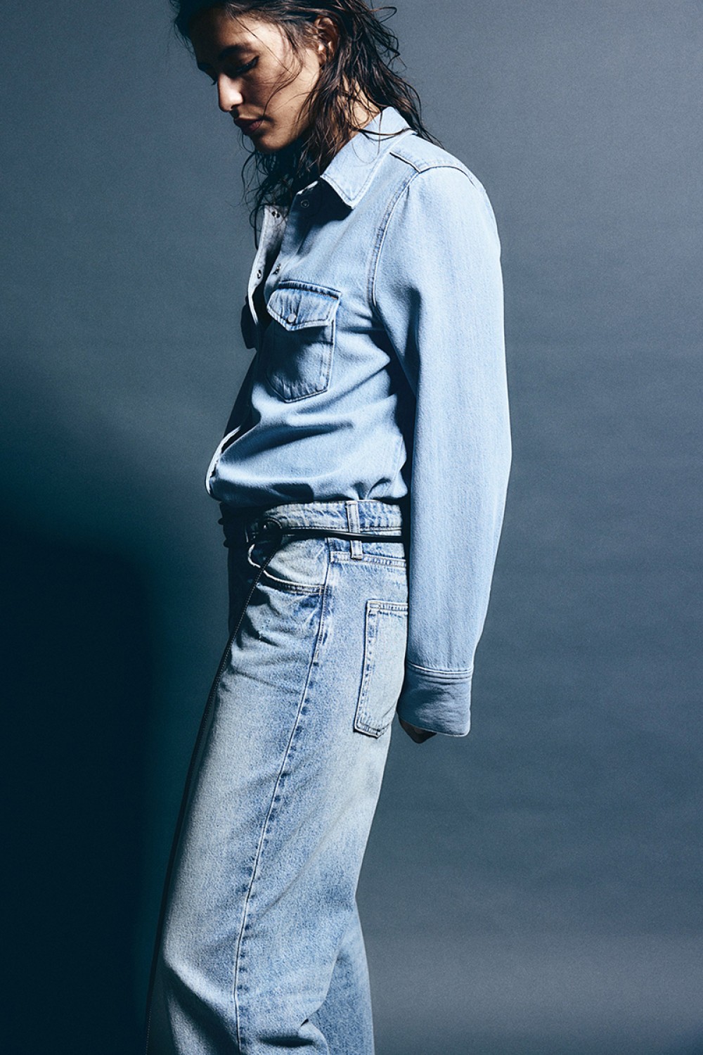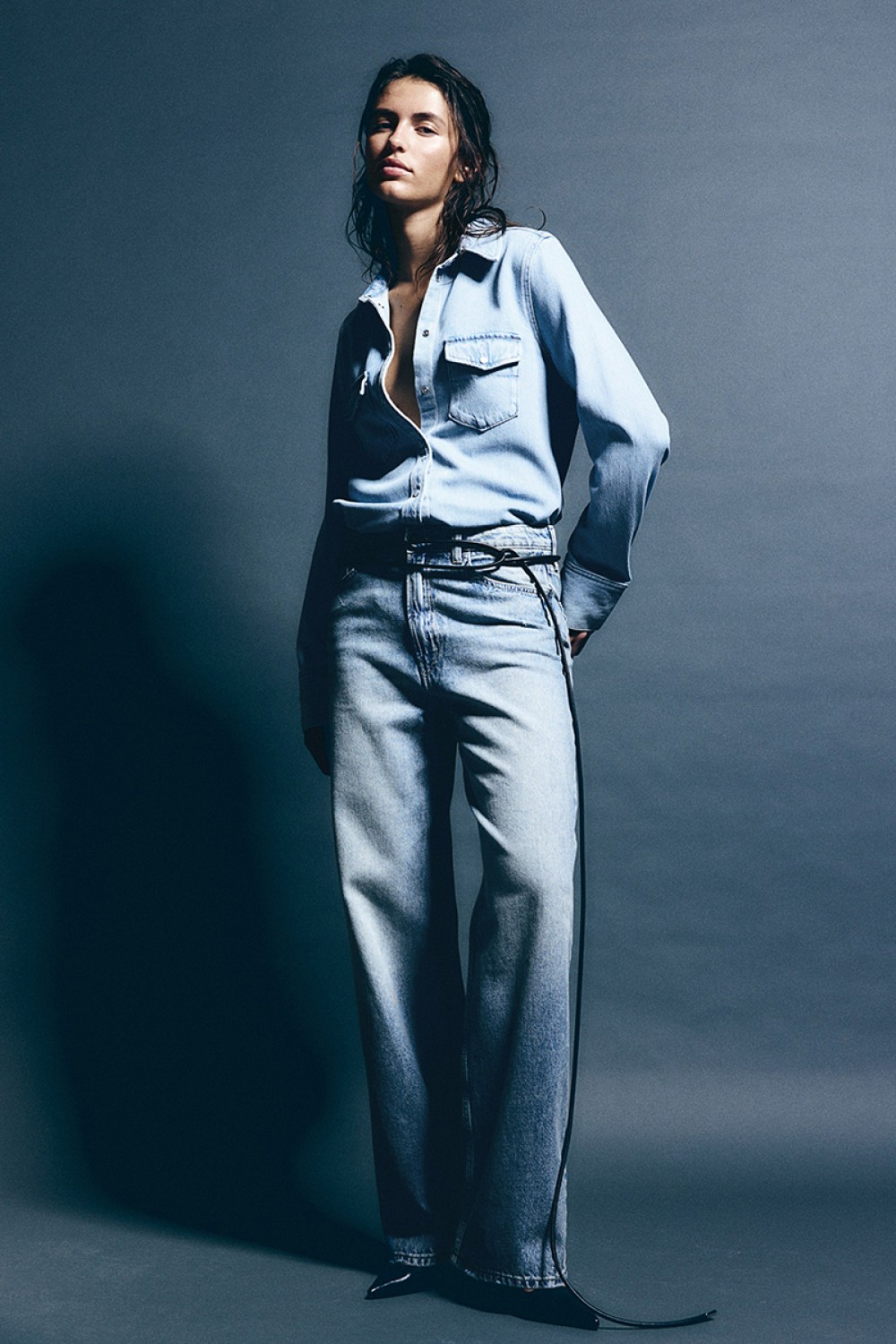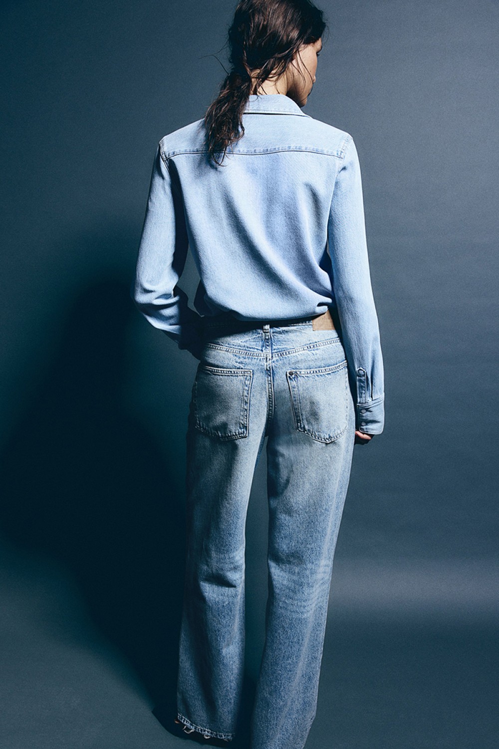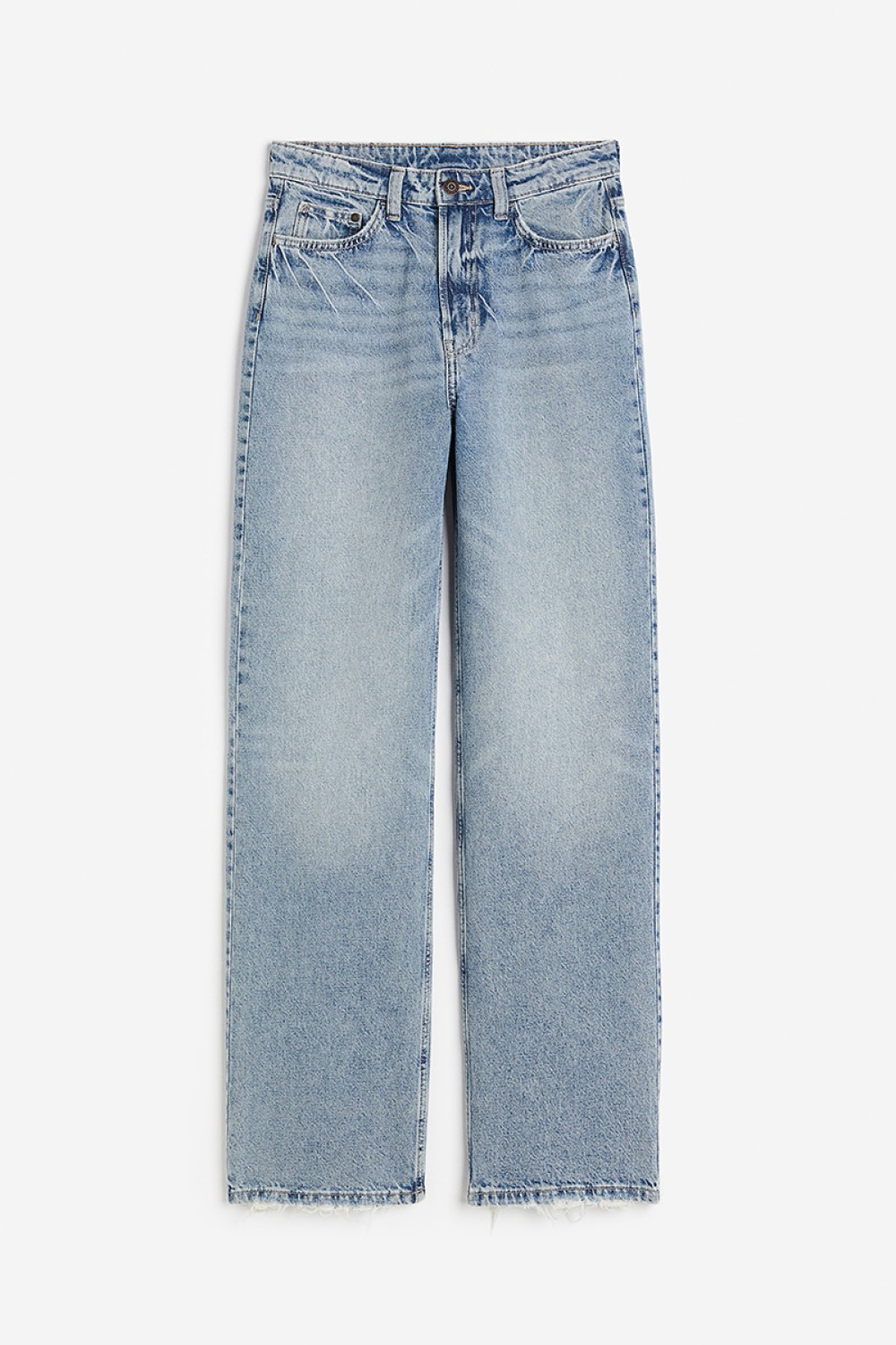 5-pocket jeans in thick cotton denim. Extra-high waist, zip fly with button, and straight, wide legs.
